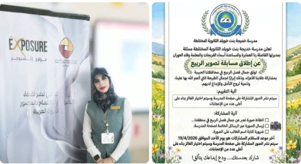 مسابقة التصوير الفوتوغرافي عن محور تصوير الربيع وتجسيداً لدور اتحاد المصورين العرب في رعاية الحركة الفوتوغرافية ودعم الطاقات الشابة، شاركت الأستاذة الفوتوغرافية تهاني المرافي، ممثلة الاتحاد عن إقليم الجنوب، في لجنة تحكيم وترشيح الأعمال المصورة المقدمة من الطلبة المبدعين.