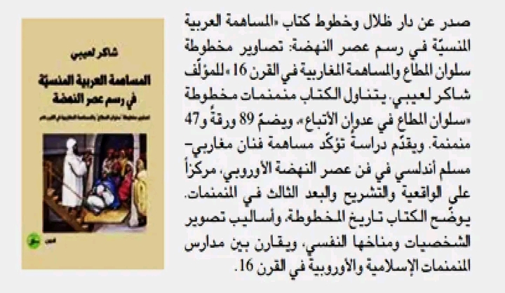 المساهمة العربية المنسيّة في رسم عصر النهضة: تصاوير مخطوطة سلوان المطاع والمساهمة المغاربية في القرن 16عرض سريع للكناب في العربي الجديد 3 مارس 2026,صدر عن دار ظلال وخطوط كتاب “المساهمة العربية المنسيّة في رسم عصر النهضة: تصاوير مخطوطة سلوان المطاع والمساهمة المغاربية في القرن 16” للمؤلّف شاكر لعيبي. يتناول الكتاب منمنمات مخطوطة “سلوان المطاع في عدوان الأتباع”، ويضمّ 89 ورقةً و47 منمنمة. ويقدّم دراسةً تؤكّد مساهمة فنان مغاربي–مسلم أندلسي في فن عصر النهضة الأوروبي، مركزاً على الواقعية والتشريح والبعد الثالث في المنمنمات. يوضّح الكتاب تاريخ المخطوطة، وأساليب تصوير الشخصيات ومناخها النفسي، ويقارن بين مدارس المنمنمات الإسلامية والأوروبية في القرن 16.# صفحة الصديق شاكر لعيب{ي# مجلة ايليت فوتو ارت.