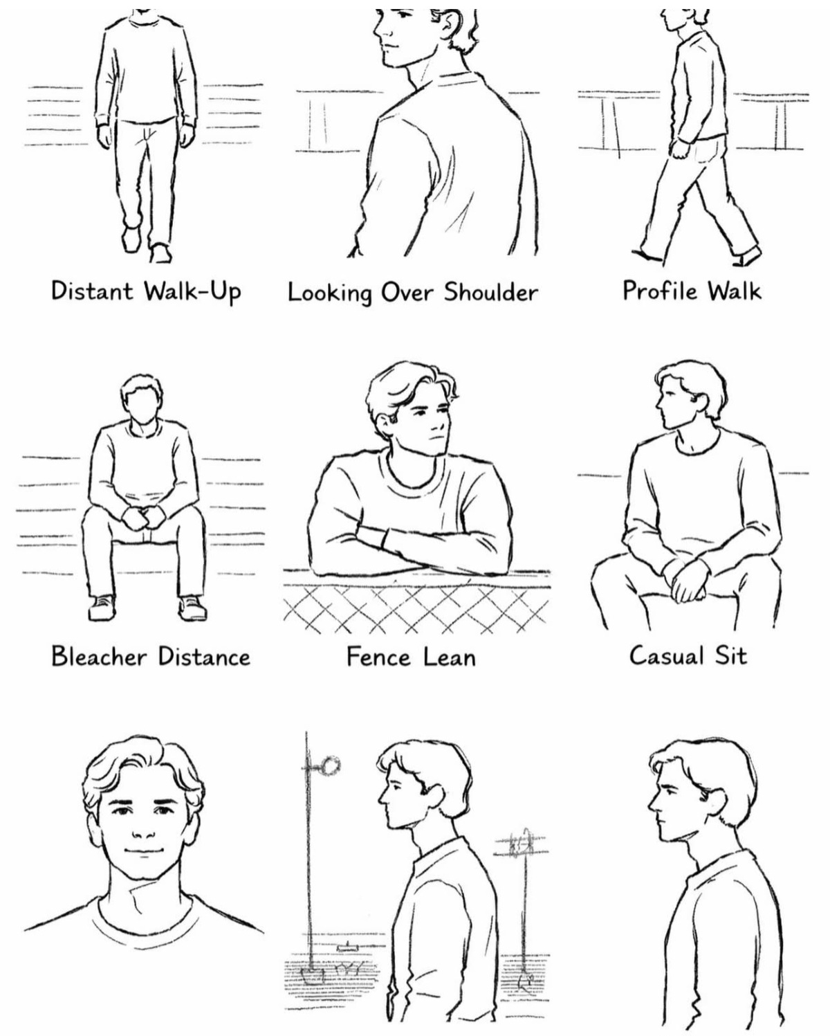 Wide → Medium → Profile → Static Sit → Headshot → Silhouette
