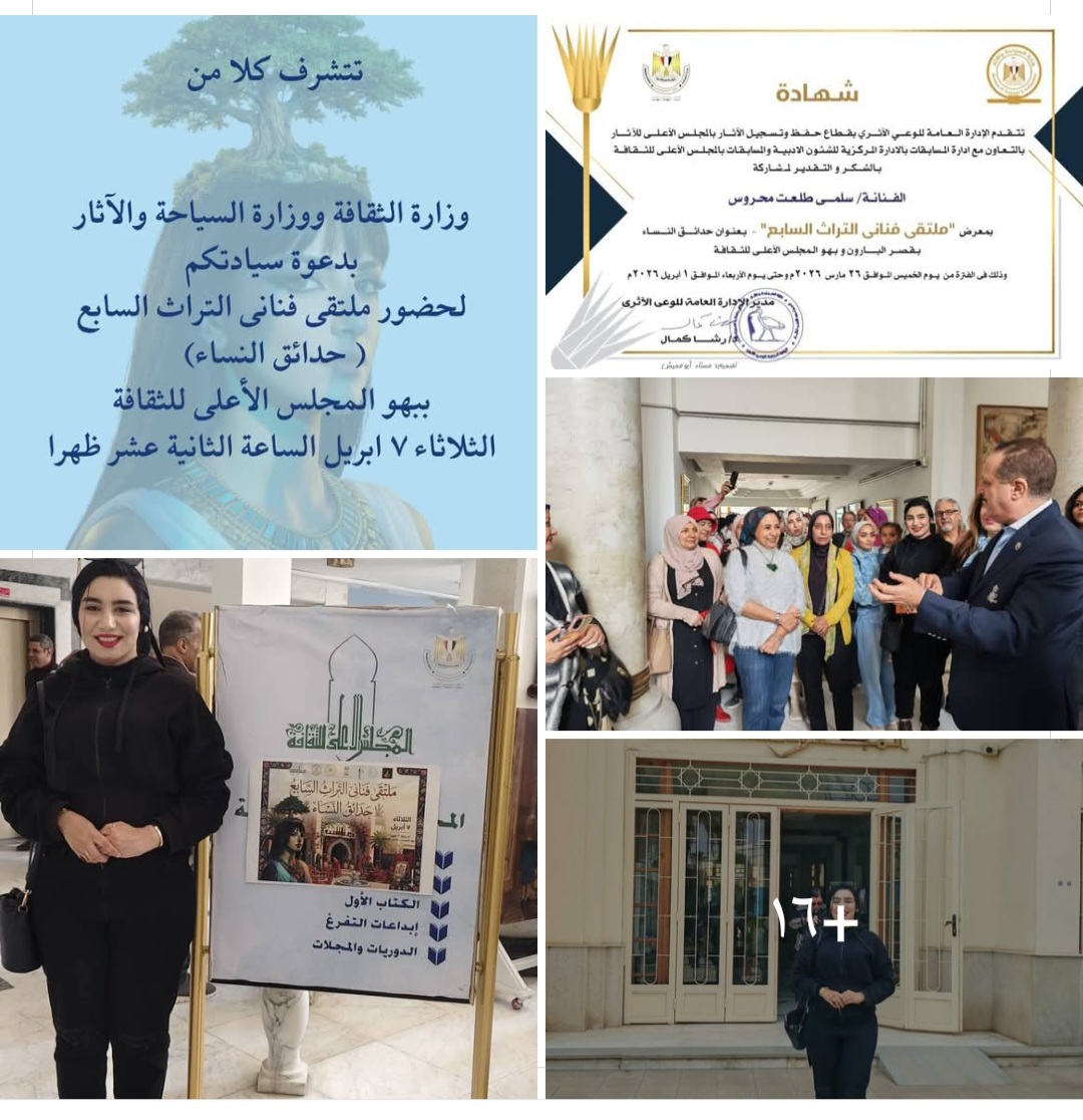 مشاركتي في معرض «حدائق النساء» يوم الثلاثاء الموافق ٧/٤/٢٠٢٦ الساعه ١٢ ظهرا بالمجلس الأعلى للثقافه بدار الأوبرا المصريه