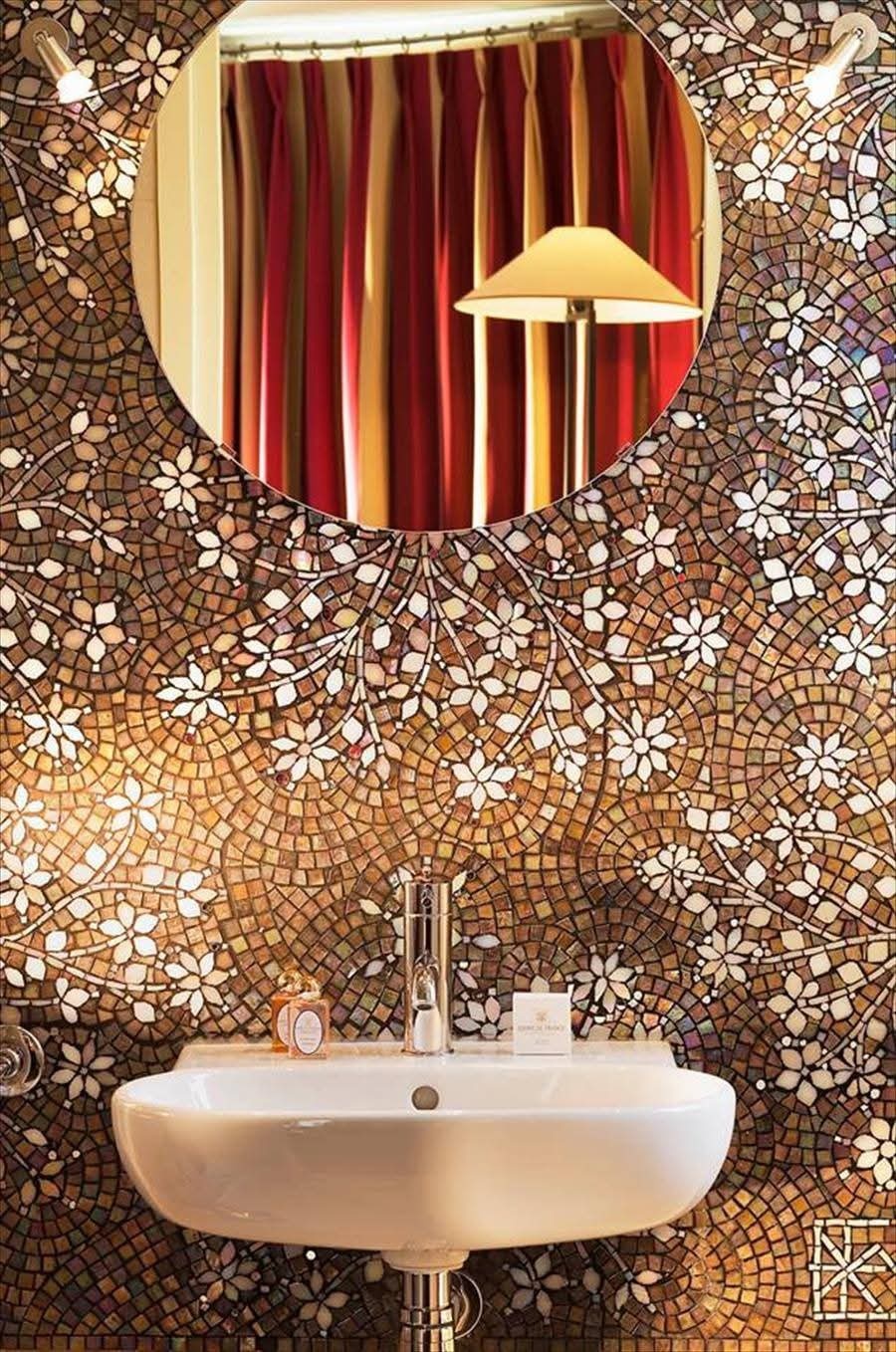 في الحمامات يتم اختيار تصميم موزاييك من السيراميك لكامل الحمام للجدران والأرضية أو جدار واحد كخلفية المرآة كخلفية.