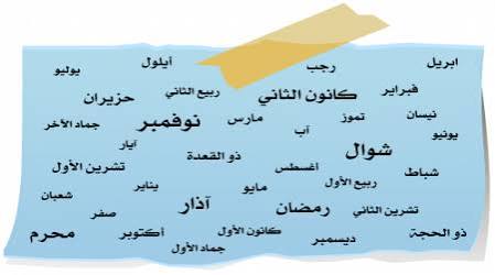 | 10 | شوال | فيه عيد الفطر | لشولان النوق فيه بأذنابها إذا حملت “أي نقصت وجف لبنها”، فيقال تشوَّلت الإبل: إذا نقص وجفّ لبنها |