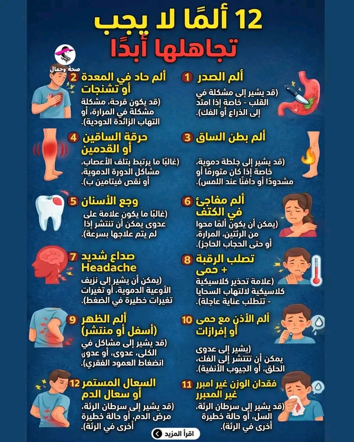 ١٢ ألماً لا يجب تجاهلها أبداً١. ألم الصدر قد يشير إلى مشكلة في القلب — خاصة إذا انتشر إلى الذراع، الفك، أو الظهر.٢. ألم حاد في المعدة أو تقلصات قد يدل على قرح، مشاكل في المرارة، أو التهاب الزائدة الدودية.٣. ألم الساق (بطة الرجل) قد يكون علامة على جلطة دموية — خاصة إذا صاحبها تورم، دفء، أو إيلام عند اللمس.٤. حرقان في الساقين أو القدمين غالباً ما يرتبط بتلف الأعصاب، ضعف الدورة الدموية، أو نقص فيتامين ب.٥. ألم الأسنان علامة على عدوى قد تنتشر إذا تُركت دون علاج.٦. ألم مفاجئ في الكتف قد يكون ألماً منقولاً من الرئتين، المرارة، أو الحجاب الحاجز.٧. صداع شديد مفاجئ قد يشير إلى نزيف، تمدد وعائي دماغي، أو تغيرات خطيرة في الضغط داخل الجمجمة.٨. تيبس الرقبة مع الحمى علامة تحذيرية كلاسيكية للالتهاب السحائي — يحتاج إلى رعاية عاجلة.٩. ألم الظهر (أسفل أو منتصف الظهر) قد يشير إلى مشاكل في الكلى، عدوى، أو مشاكل في العمود الفقري.١٠. ألم الأذن مع حمى أو إفرازات يشير إلى عدوى قد تنتشر إلى الفك، الحلق، أو الجيوب الأنفية.١١. فقدان وزن غير مبرر قد يكون علامة على السرطان، السكري، أو أمراض خطيرة أخرى.١٢. سعال مستمر أو سعال مصحوب بدم قد يشير إلى السل، سرطان الرئة، أو مرض رئوي شديد.—تذكير هام: هذه المعلومات لأغراض التوعية ولا تغني عن استشارة الطبيب. إذا واجهت أيًا من هذه الأعراض، خاصة إذا كانت شديدة أو مفاجئة، فاطلب الرعاية الطبية فورًا.#صحة #الوعي_الصحي #الطوارئ_الطبية #العناية_بالجسم #الوقاية_خير_من_العلاج# مجلة ايليت فوتو ارت