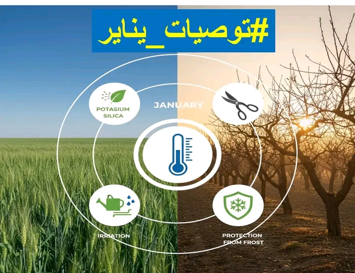 🎨 “خارطة طريق النصف الثاني من يناير” 📅المرجع الشامل لمعاملات شهر يناير (طوبة) – بوابة الإنتاجية 🚀”خطواتك الذكية لتأمين محصولك من برد الشتاء”1: المحاصيل الحقلية (القمح والفول والبنـجر) 🌾القمح:🛑 ممنوع: رش مبيدات الحشائش إذا ظهرت “العقدة الأولى” (مرحلة الاستطالة).✅ مطلوب: الرش الوقائي للصدأ الأصفر عند وجود ضباب أو ندى كثيف.الفول البلدي:🌸 التزهير: إضافة (كالسيوم بورون + زنك) لتثبيت العقد ومنع تساقط الأزهار.🦟 المن: الفحص الدوري لقلب النبات ومكافحة المن فوراً لمنع نقل الفيروسات.البنجر:🥔 التحجيم: الرش بورون وبوتاسيوم لزيادة نسبة السكر وحجم الجذور.2: الفاكهة (المتساقطات والموالح) 🍇🍎العنب واللوزيات:✂️ التقليم: الانتهاء من أعمال التقليم الشتوي وتطهير الجروح بأكسيد النحاس.🧪 كسر السكون: البدء في رش (الدورمكس) حسب الصنف واحتياجات البرودة (راجع جداولنا السابقة).الموالح والمانجو:🧼 النظافة: غسيل الأشجار بالصابون البوتاسي والزيت الشتوي للتخلص من العفن الهبابي.🍂 التسميد: الانتهاء من إضافة الخدمة الشتوية (السماد العضوي + السوبر فوسفات).3: محاصيل الخضر (البطاطس، الطماطم، الفراولة) 🥔🍓البطاطس الصيفية:🗡️ التقاوي: التقطيع الصحيح والتطهير بمبيدات أعفان الجذور قبل الزراعة.الطماطم والفلفل:🛡️ الحماية: رش “سليكات البوتاسيوم” قبل موجات الصقيع المتوقعة بـ 48 ساعة.الفراولة:🍄 أعفان الثمار: مراقبة الرطوبة والرش الوقائي للفطريات خاصة بعد الأمطار.4: نصائح “الإدارة الذكية” ⚠️الري: الري “على الحامي” في المساء قبل ليالي الصقيع الشديد لتدفئة التربة.التسميد: قلل النيتروجين (اليوريا) وزود البوتاسيوم والفوسفور لرفع مناعة النبات.التهوية: فتح الصوب نهاراً للتخلص من الرطوبة الزائدة ومنع أمراض “اللفحة والندوات”.📢 زكاة العلم نشره! مع تحيات: صفحة الزراعة الذكية 💡#نباتات #رعاية_النباتات#مجلة ايليت فوتو ارت.