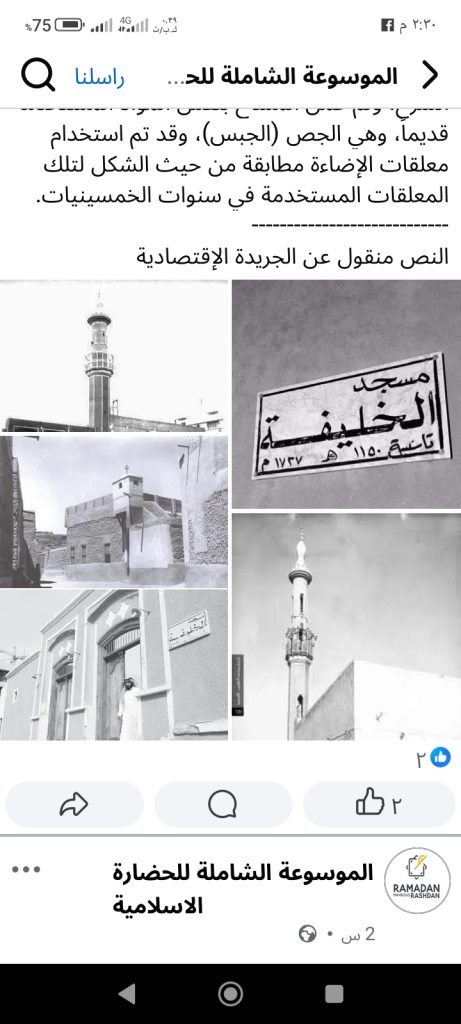 مسجد الخليفة .. أكبر مساجد الكويت التراثية يعتبر مسجد الخليفة واحداً من أقدم وأكبر المساجد التراثية القائمة في الكويت حتى الآن، وقد بني سنة 1226هـ – 1811م، بحسب مصادر دائرة الأوقاف العامة، وقد أسسته عائلة آل خليفة الحاكمة في البحرين بعد رحيلها من الكويت، ولاقى المسجد اهتماماً كبيرا من عائلة الصباح الحاكمة، ليس لأنه يقع بالقرب من فريج الشيوخ في منطقة الشرق فحسب، بل لأنه اعتبر مسجد الدولة الرسمي حتى عهد قريب، كما يبرهن على اهتمام آل الصباح بالمسجد قيام الشيخ مبارك الكبير بتجديد بنائه وتوسعته في سنة 1319هـ – 1901م وذلك على نفقته الخاصة. أغلب المسجد القائم هو ما تم بناؤه في سنة 1901، وقد بنيت حوائط المسجد في ذلك الحين من الطين وأسقفه من خشب (الجندل)، واحتوى المسجد على مدخلين أحدهما رئيس مقابل البحر من ناحية الشمال، والمدخل الآخر من ناحية الجنوب على تل بهيته، حيث يتم الدخول إلى المسجد نزولاً عدة درجات، وقد كانت تحيط الشوارع والسكك بالمسجد من ثلاث جهات تاركة الجهة الشرقية مجاورة للمنازل، أما دورات المياه والوضوء فقد كانت من الناحية الشمالية الشرقية ناحية البحر. والليوان كما هو عليه الآن كبير، ويتكون من صفين من الأعمدة الخشبية وبه محراب خاص به، حيث كانت تقام الصلوات في الليوان والحوش في أثناء أيام الصيف الحارة، أما المنارة فكانت قصيرة، ويتم الصعود إليها من خلال درج مفتوح على حوش المسجد. وفي منتصف الخمسينيات من القرن العشرين تم عمل تعديلات كثيرة من قبل دائرة الأوقاف العامة على الجزء الشرقي من المسجد، شملت هدم وإعادة بناء لحوائط حوش المسجد والمنارة ودورات المياه والوضوء، كما شملت التعديلات إضافة نقوش أسفل الحوائط الخارجية للمسجد، وقد تمت إعادة بناء ما سبق ذكره بواسطة الخرسانة والطابوق الأسمنتي، وتمت المحافظة في هذه الفترة على الحوائط الطينية للحرم والليوان، إضافة إلى سقف الجندل التقليدي، وفي فترة لاحقة تمت إزالة سقف الجندل وطبقات الطين فوقه، وتم استبدالها بسقف صناعي من الخشب وجلمون حديد مغطى بألواح الحديد (الشينكو)، وتمت تغطية الحوش ببلاط الموازيك، ونظرا لقربه من المسجد الكبير الذي بني فترة الثمانينيات من القرن العشرين ولحالته الإنشائية غير المرضية تم غلق المسجد أمام المصلين. وفي سنة 1996م، اعتبر المسجد من أهم المساجد التراثية والواجب المحافظة عليها، وتم عمل التوثيق والاختبار للمسجد في سنة 1997م، وبوشر بأعمال التصميم على أساس المحافظة على المسجد وإضافة توسعة داخل الحوش لسكن الإمام والمؤذن. وفي سبيل المحافظة على الطابع التراثي للمسجد تمت إعادة وضع مواد السقف القديم في (الجندل) والباسجيل والحصير، وتمت المحافظة على الحوائط الطينية للمسجد والبالغة سماكتها نحو المتر، كما تمت إزالة بلاط الموزايك في الحوش والليوان، وتم تركيب بلاط من الآجر الجديد بنفس المقاس وتوزيع الآجر القديم الذي وجد تحت بلاط الموزايك، كما تمت المحافظة على بقايا بلاط الآجر القديم في الحرم، حيث غطي بطبقة من النايلون والخرسانة المسلحة. إضافة إلى ذلك، تم اكتشاف فتحات للإنارة والتهوية فوق كل شبابيك الحرم، كان قد تم غلقها في فترات سابقة بالمباني، وتمت إعادة فتحها ووضع شبابيك خشبية في هذه الفتحات، وتم ترميم مكان شرب المياه (الحب) في الحوش حسب موقعه القديم، أما من الناحية الإنشائية فقد تم حقن التربة حول قواعد الحوائط الطينية وأسفلها، وذلك لتقويتها، وتمت معالجة الشروخ في الحوائط حسب الطريقة القديمة من خلال عمل جبيرة من خشب الجندل متعارضة مع اتجاه الشرخ، وتم عمل المساح بنفس المواد المستخدمة قديماً، وهي الجص (الجبس)، وقد تم استخدام معلقات الإضاءة مطابقة من حيث الشكل لتلك المعلقات المستخدمة في سنوات الخمسينيات.—————————-النص منقول عن الجريدة الإقتصادية # الموسوعة الشاملة للحضارة الاسلامية # مجلة ايليت فوتو ارت.