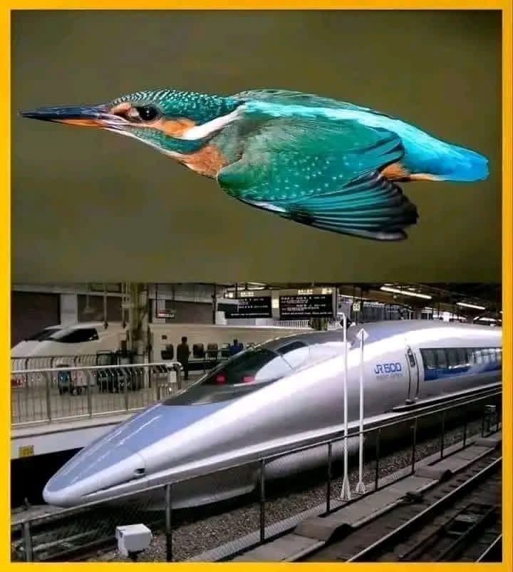 تم توظيف شكل الطائر لتحسين التكنولوجيا البشرية فالقطار الياباني شينكانسن المعروف بالقطار الرصـ اصة كان عندما تبلغ سرعة 200 ميل في الساعة يتسبّب في خلق موجة صوتية إنفجـ ارية Sonic Boom صاخبة جدا في كلّ مرة يدخل فيها نفقا، بحيث أنّ الاهالي القاطنين على بعد 15 ميلا كان يسمعون هذا الصوت المدويّ، وسبب هذا الصوت هو مقدمة القطار التي ليست انسيابية بالقدر الكافي فتسحب معها قدرا كبيرا من الهواء الذي ينضغط بشدة لحظة الدخول إلى النفق وينتج عنه ذلك الصوت المدويّ!