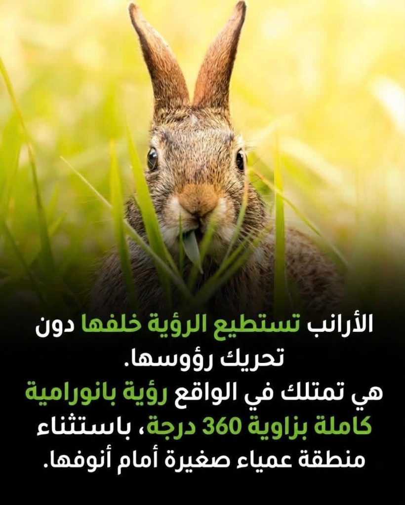 بالنسبة للأرنب، “النظر للخلف” ليس خياراً، بل ضرورة حتمية للبقاء. هم حيوانات فريسة، وهذا يعني أن الخطر قد يأتي من أي مكان وفي أي لحظة: ذئب يتربص من خلف شجرة، أو صقر ينقض من السماء. هذه العيون الخارقة تعمل كجهاز إنذار مبكر، يسمح لهم برصد أي حركة مريبة من أي اتجاه والهروب قبل أن يلاحظهم المفترس.