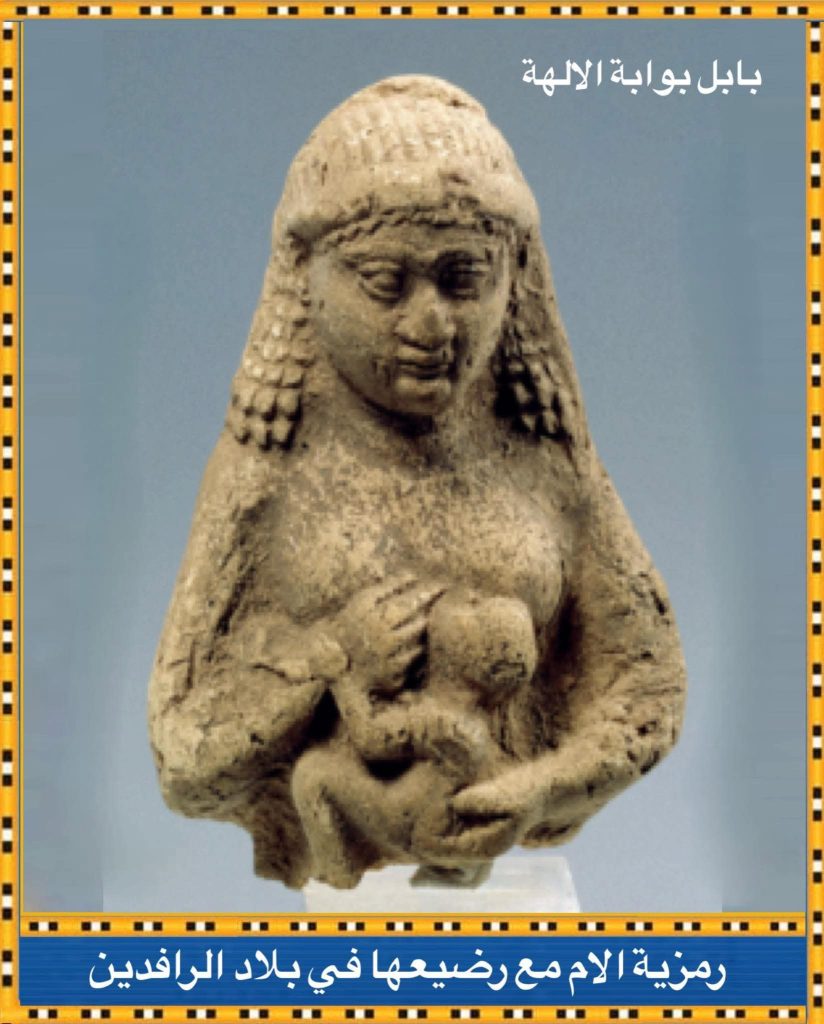 الأم البابلية وهي ترضع صغيرها ،تمثال صغير مصنوع من الطين المفخور في الفرن ، ويعود تاريخه بحدود العام 700 ق. م
