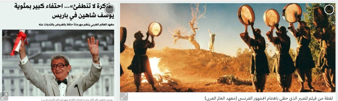يحتفي معهد العالم العربي في باريس بالذكرى المئوية لميلاد المخرج المصري يوسف شاهين من خلال تنظيم مهرجان تحت عنوان «يوسف شاهين… قرن من الحرية وذاكرة لا تنطفئ» على مدى 4 أيام، متضمناً عروضاً مختارة من أفلامه وندوات تثير نقاشاً حول أعماله.