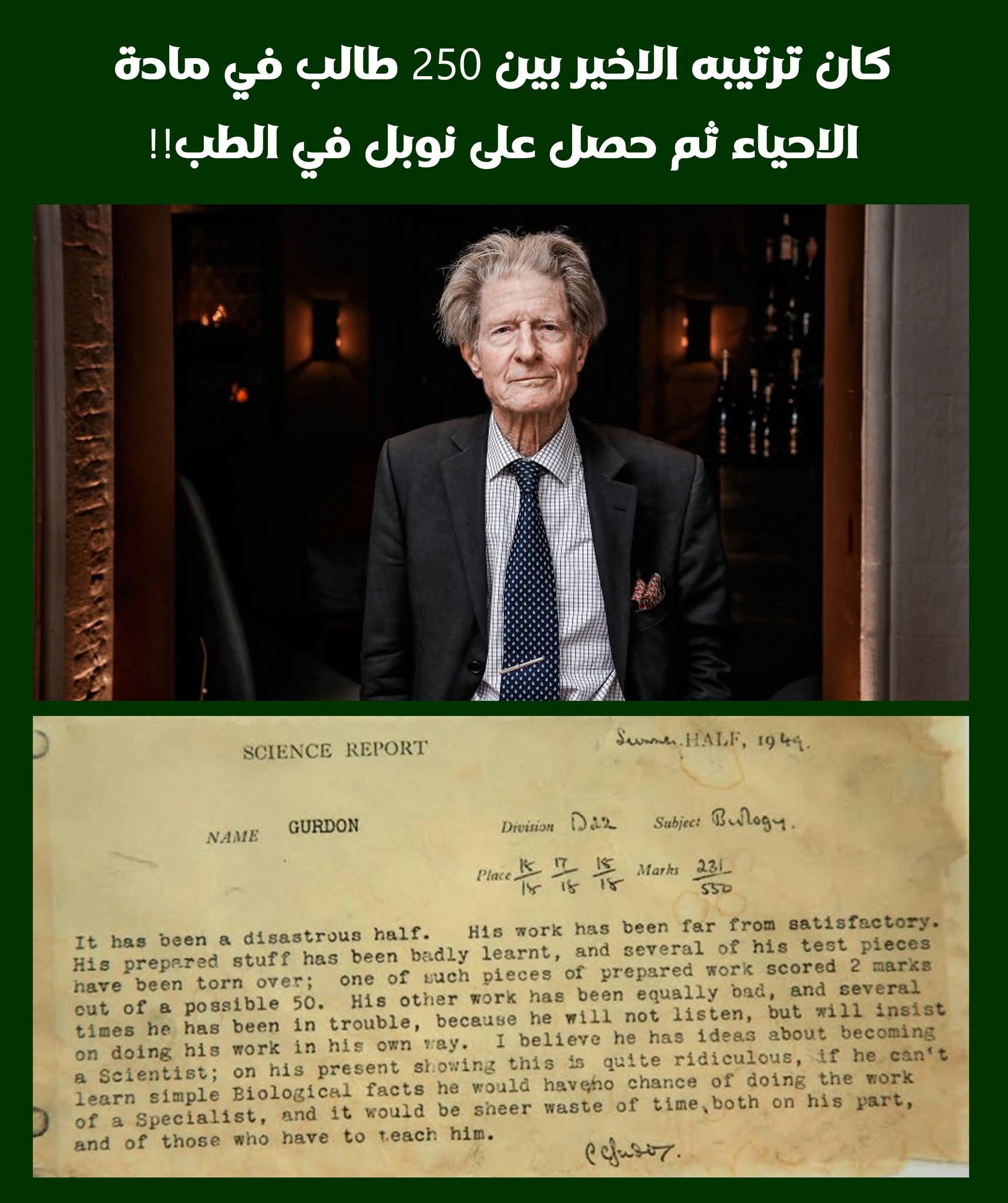 صدق أو لا تصدق حصل جون جوردون على 2 من 50 في مادة الاحياء وكان ترتيبه الاخير بين 250 طالب وبعدها بـ 60 سنة حصل على نوبل في الطب !!!