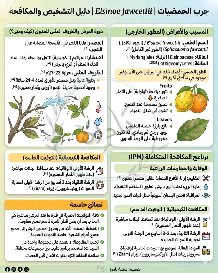 🌱🍊 تنبيه: فطر Elsinoe fawcettii 🍊🌱Elsinoe fawcettii (التبقع السوري – العين الضفدعية)⚠️ عدو لا تراه.. يشوه الثمار ويفقدها قيمتها التسويقية!🧬 ما هو؟فطر (Elsinoe fawcettii) هو المسبب الرئيسي لمرض “التبقع السوري” أو “العين الضفدعية” (Citrus Scab)، وهو من الأمراض الفطرية الهامة التي تصيب الحمضيات:▪️ يصيب الأوراق والأفرع والثمار الحديثة.▪️ يسبب تشوهات واضحة وتقرحات خشبية.▪️ يؤثر سلبًا على جودة الثمار وقيمتها التسويقية.▪️ ينتشر بشكل رئيسي في المناطق الرطبة والدافئة.🔬 خصائص الفطر:▪️ يعيش الفطر على شكل أبواغ جنسية ولا جنسية.▪️ ينتشر بسرعة في الظروف الرطبة.▪️ يصيب الأنسجة الحديثة (الفيتّة) بشكل أساسي.▪️ يفضل درجات الحرارة المعتدلة (20-28 درجة مئوية).🕵️ الأعراض: كيف تتعرف على المرض؟🍂 على الأوراق:▪️ تظهر بقع صغيرة مائية شفافة في البداية.▪️ تتحول فيما بعد إلى بقع خشنة وبارزة (تشبه الثؤلول).▪️ تصبح الأوراق مشوهة وملتفة.▪️ لون الآفات يميل للرمادي أو البني.▪️ تساقط الأوراق المصابة بشدة.🍊 على الثمار:▪️ ظهور بقع خشنة وبارزة على قشرة الثمرة (تشبه الفلين).▪️ تشوه شكل الثمرة (تصبح غير منتظمة).▪️ خشونة القشرة وتغير لونها (بني – رمادي).▪️ تشقق القشرة في الحالات المتقدمة.▪️ انخفاض كبير في القيمة التسويقية للثمار.🌿 على الأفرع:▪️ تقرحات صغيرة خشنة على الأفرع الحديثة.▪️ موت الأفرع المصابة في بعض الحالات.🧩 لا تعتمد على العين وحدها:التشخيص المخبري ضروري للتأكد من نوع الفطر.🌡️ ظروف انتشار المرض (البيئة المناسبة):💧 رطوبة عالية (أهم عامل):🔹 وجود ماء حر على الأوراق والثمار لفترات طويلة (ندى – رذاذ – أمطار).🔹 رطوبة نسبية مرتفعة (>90%).🌡️ حرارة معتدلة:🔹 النطاق المثالي للعدوى: 20-28°م.🌿 أنسجة حديثة:🔹 يصيب الأوراق والثمار في مراحل نموها الأولى (الفيتّة).🍂 الرياح والأمطار:🔹 تساعد على انتشار الأبواغ ونقلها من الأشجار المصابة للسليمة.🎯 العوائل الرئيسية:🍊 الأكثر حساسية:🔹 ليمون (خاصة الأضاليا والبنزهير).🔹 يوسفي (أفندي – كلمنتينا).🔹 نارنج.🔹 بعض أصناف البرتقال (خاصة الأبو سرة).🟡 الأقل حساسية:🔹 برتقال بلدي – فالنسيا.🔹 جريب فروت.🔹 ليمون حلو.❌ لا يصيب:🔹 الليمون الحلو (أقل حساسية).🛡️ الوقاية: هي الأساس!✅ اختيار أصناف مقاومة (إن أمكن):🔹 استشر المرشد الزراعي لاختيار أصناف أقل حساسية.✅ شتلات سليمة (معتمدة):🔹 التأكد من خلو الشتلات من الأعراض قبل الزراعة.✅ تقليم جيد:🔹 فتح قلب الشجرة (تهوية جيدة – دخول ضوء).🔹 إزالة الأفرع المصابة والمتشابكة.✅ نظافة الحقل:🔹 إزالة بقايا التقليم والمصاب (حرق أو دفن بعيدًا).🔹 مكافحة الحشائش.✅ ري مناسب:🔹 تجنب الري بالرش (يزيد الرطوبة).🔹 الري بالتنقيط (الأفضل).✅ تسميد متوازن:🔹 تجنب الإفراط في النيتروجين (يضعف الجدران الخلوية).🔹 بوتاسيوم وكالسيوم (يقوي الأنسجة).⚕️ المكافحة الكيميائية (إذا ظهر المرض):🧪 مبيدات فطرية وقائية (الأساس):🔹 مركبات النحاس (أوكسي كلور النحاس – هيدروكسيد النحاس – بوردو مخلوط).🔹 تطبق في بداية موسم النمو وقبل وبعد التزهير.🧪 مبيدات جهازية (علاجية ووقائية):🔹 ستروبيلورين (أزوكسيستروبين – كريسوكسيم ميثيل).🔹 تريازول (دايفينوكونازول – تيبوكونازول).🔹 بنزيميدازول (كاربندازيم).⏱️ توقيت الرش (حاسم للنجاح):🌸 قبل التزهير:🔹 رشة وقائية (نحاس) بعد خروج الأوراق الحديثة.🌸 بعد العقد:🔹 رشة مباشرة بعد تساقط البتلات (نحاس أو مبيد جهازي).🔹 رشة ثانية بعد 2-3 أسابيع (إذا استمرت الرطوبة).🌿 أثناء موسم النمو:🔹 رش وقائي كل 3-4 أسابيع في المناطق الرطبة.🔹 التناوب بين مجموعات المبيدات.🔄 التناوب بين المبيدات:🔹 لا تعتمد على مجموعة واحدة (منع المقاومة).🌾 ممارسات أخرى:✅ جمع الثمار المصابة:🔹 التخلص منها (حرق) لتقليل مصدر العدوى.✅ حماية النموات الحديثة:🔹 التركيز على الأوراق والثمار الفتية (الأكثر عرضة).💡 تذكير حاسم:❌ لا تنتظر حتى تشوه الثمار!✅ الليمون 