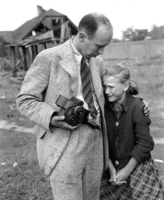 لقطة مؤثرة للمصور الفرنسي جوليان برايان وهو يحتضن فتاة بولندية في أحد شوارع وارسو، بولنداقبل دقائق فقط، فقدت أختها الكبرى التي قتلتها غارة جوية ألمانية شنتها طائرات سلاح الجو الألماني في بداية غزو بولندا عام 1939 كانت الفتاة في حالة صدمة وانهيار، والمصور لم يتمالك نفسه… فوضع الكاميرا جانبًا، ومد لها ذراعيهبولندا، 13 سبتمبر 1939إنها ليست مجرد صورة… إنها شهادة صامتة على وجع الحربكواليس الحرب العالمية الثانية.. ـد.جوزيف زيتون ـ مجلة ايليت فوتو ارت.