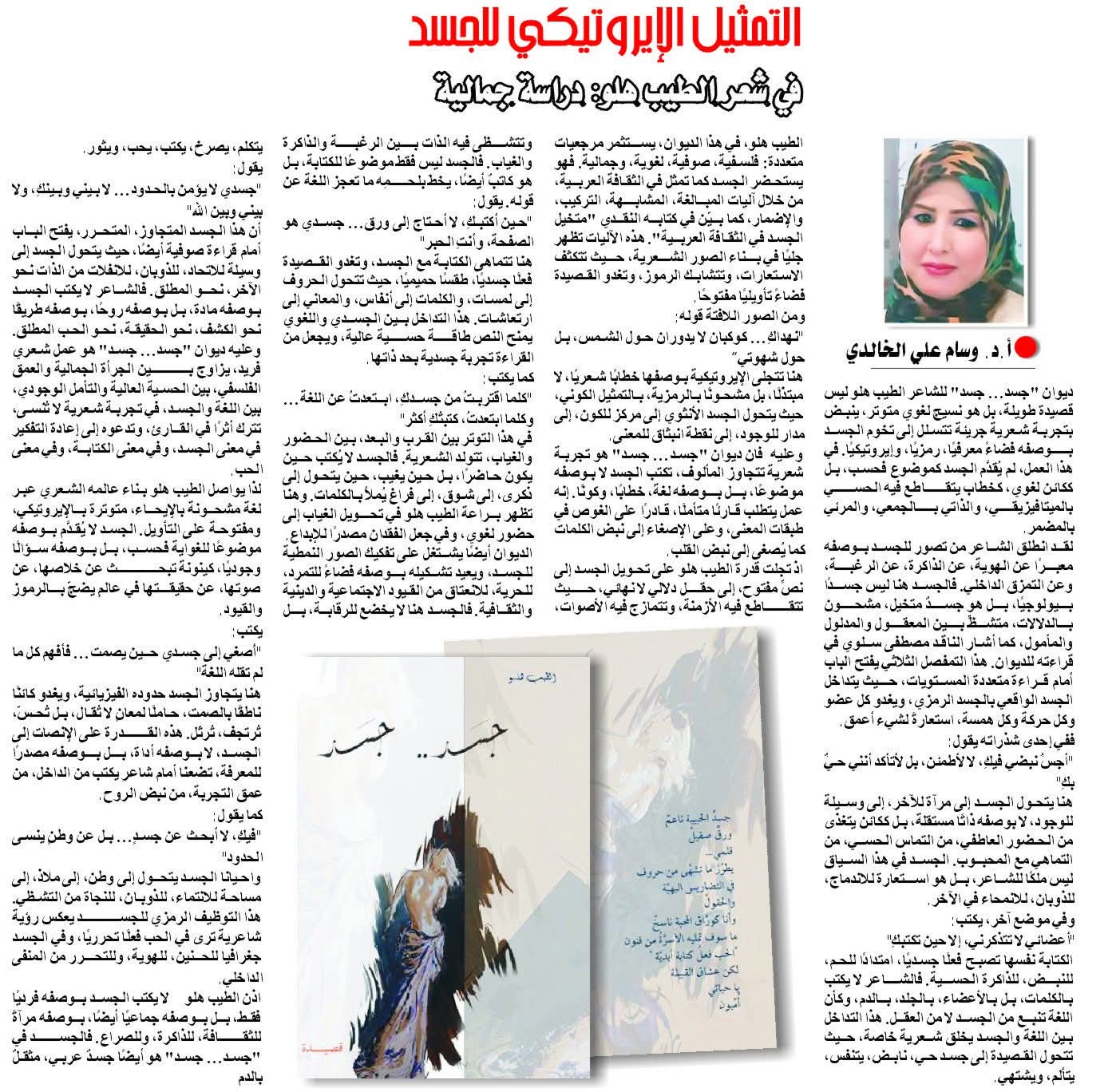اذ تجلت قدرة الطيب هلو على تحويل الجسد إلى نصٍّ مفتوح، إلى حقل دلالي لا نهائي، حيث تتقاطع فيه الأزمنة، وتتمازج فيه الأصوات، وتتشظى فيه الذات بين الرغبة والذاكرة والغياب. فالجسد ليس فقط موضوعًا للكتابة، بل هو كاتبٌ أيضًا، يخطّ بلحمِه ما تعجز اللغة عن قوله. يقول:”حين أكتبكِ، لا أحتاج إلى ورق… جسدي هو الصفحة، وأنتِ الحبر”هنا تتماهى الكتابة مع الجسد، وتغدو القصيدة فعلًا جسديًا، طقسًا حميميًا، حيث تتحول الحروف إلى لمسات، والكلمات إلى أنفاس، والمعاني إلى ارتعاشات. هذا التداخل بين الجسدي واللغوي يمنح النص طاقة حسية عالية، ويجعل من القراءة تجربة جسدية بحد ذاتها.كما يكتب:”كلما اقتربتُ من جسدكِ، ابتعدتُ عن اللغة… وكلما ابتعدتُ، كتبتُكِ أكثر”في هذا التوتر بين القرب والبعد، بين الحضور والغياب، تتولد الشعرية. فالجسد لا يُكتب حين يكون حاضرًا، بل حين يغيب، حين يتحول إلى ذكرى، إلى شوق، إلى فراغٍ يُملأ بالكلمات. وهنا تظهر براعة الطيب هلو في تحويل الغياب إلى حضور لغوي، وفي جعل الفقدان مصدرًا للإبداع.الديوان أيضًا يشتغل على تفكيك الصور النمطية للجسد، ويعيد تشكيله بوصفه فضاءً للتمرد، للحرية، للانعتاق من القيود الاجتماعية والدينية والثقافية. فالجسد هنا لا يخضع للرقابة، بل يتكلم، يصرخ، يكتب، يحب، ويثور.يقول:”جسدي لا يؤمن بالحدود… لا بيني وبينكِ، ولا بيني وبين الله”أن هذا الجسد المتجاوز، المتحرر، يفتح الباب أمام قراءة صوفية أيضًا، حيث يتحول الجسد إلى وسيلة للاتحاد، للذوبان، للانفلات من الذات نحو الآخر، نحو المطلق. فالشاعر لا يكتب الجسد بوصفه مادة، بل بوصفه روحًا، بوصفه طريقًا نحو الكشف، نحو الحقيقة، نحو الحب المطلق. وعليه ديوان “جسد… جسد” هو عمل شعري فريد، يزاوج بين الجرأة الجمالية والعمق الفلسفي، بين الحسية العالية والتأمل الوجودي، بين اللغة والجسد، في تجربة شعرية لا تُنسى، تترك أثرًا في القارئ، وتدعوه إلى إعادة التفكير في معنى الجسد، وفي معنى الكتابة، وفي معنى الحب.لذا يواصل الطيب هلو بناء عالمه الشعري عبر لغة مشحونة بالإيحاء، متوترة بالإيروتيكي، ومفتوحة على التأويل.