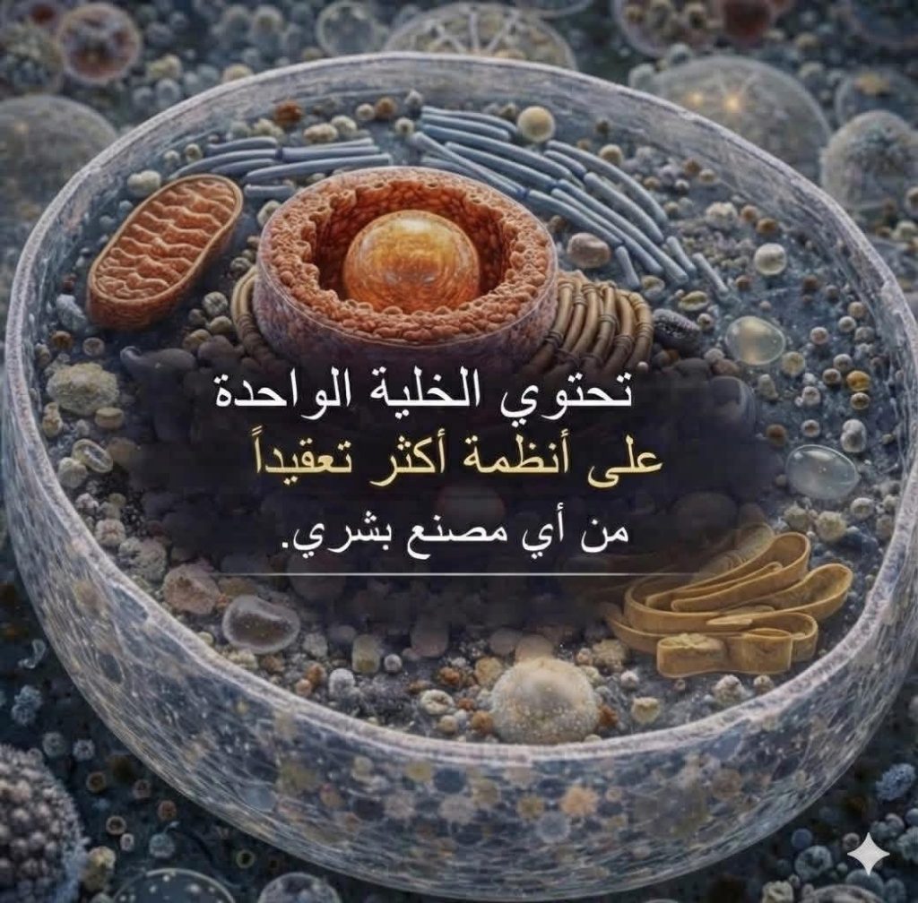 المقولة في الصورة ليست مجرد تعبير مجازي، بل هي حقيقة علمية تُذهل العقول. فالعلم يخبرنا أن الخلية الواحدة تحتوي على أنظمة “تعقيداً” وتنسيقاً تتفوق بمراحل على أذكى المصانع التي بناها البشر.