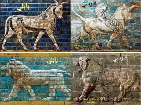 6_ حتى أن الفن الفارسي المعماري وغيره عبر العصور متأثر أو مقتبس من الفن العراقي القديم من حيث الفسيفساء وغيرها مثل الغريفين الفارسي(مخلوقات خيالية) تشابه فكرة المشخوشو البابلي والثور المجنح الآشوري وغيرها.