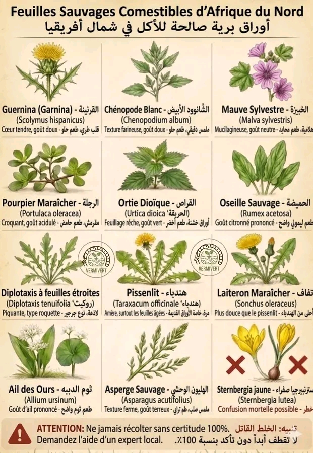 🌿 دليل المذاق: اكتشفوا الخصائص النكهية لنباتاتنا البرية في شمال أفريقيا!الأرض التي نمشي عليها كنزٌ حقيقي من النكهات. 🌱 بدلاً من اعتبارها أعشاباً عادية، دعونا نتعرف على المذاق الفريد لكل نبات، ونكتشف معاً بيئاتها الطبيعية ومواسم ظهورها.إليكم دليلاً مبسطاً يجمع بين الطعم، الموسم، والبيئة المناسبة لكل نبات:📚 دليلك الميداني المختصر: * القرنينة (Garnina) (Scolymus hispanicus) | المذاق: غني، يشبه طعم الخرشوف. 📅 الموسم: الشتاء-الربيع | 🏞️ البيئة: الأراضي العشبية وحواف الطرق. * الشانوبود الأبيض (Chenopodium album) | المذاق: خفيف، يشبه السبانخ. 📅 الموسم: الربيع-الصيف | 🏞️ البيئة: الحقول والحدائق. * الخبيزة (Malva sylvestris) | المذاق: طري، نكهة نباتية هادئة. 📅 الموسم: الربيع-الخريف | 🌳 البيئة: المناطق الرطبة والغابات. * الرجلة (Portulaca oleracea) | المذاق: حامض قليلاً ومنعش. 📅 الموسم: الصيف-الخريف | 🌞 البيئة: الأراضي المشمسة والرملية. * القراص/الحريقة (Urtica dioica) | المذاق: نكهة غنية، تشبه الخضروات الورقية المركزة. 📅 الموسم: الربيع-الخريف | 💧 البيئة: المناطق الرطبة والمظللة. * الحميضة (Rumex acetosa) | المذاق: حامض جداً وليموني. 📅 الموسم: الربيع | 🌧️ البيئة: المروج الرطبة. * جرجير وحشي (Diplotaxis tenuifolia) | المذاق: حار، فلفلي وقوي. 📅 الموسم: الربيع-الصيف | 🏜️ البيئة: الأراضي الصخرية والقاحلة. * هندباء (Taraxacum officinale) | المذاق: مرّ بوضوح، يزداد مع النضج. 📅 الموسم: الربيع-الخريف | 🌼 البيئة: الحقول والمروج. * تيفاف ناعم (Sonchus oleraceus) | المذاق: حلو قليلاً، أقل مرارة من الهندباء. 📅 الموسم: الربيع-الخريف | 🏘️ البيئة: الأراضي المحروثة والحدائق. * هليون وحشي/السكوم (Asparagus acutifolius) | المذاق: نكهة ترابية، تشبه الهليون التقليدي. 📅 الموسم: أوائل الربيع | 🍂 البيئة: الأحراش الجافة والمشمسة.⚠️ تنبيه هام للسلامة: * ثوم الدب (Allium ursinum) | المذاق: نكهة ثوم قوية ومنعشة. 📅 الموسم: أوائل الربيع | 🌲 البيئة: الغابات المظللة. * سترنبيرجيا صفراء (Sternbergia lutea) | تنبيه خطر! سامة جداً – تجنبوها تماماً. 📅 الموسم: الخريف | 🪨 البيئة: المناطق الصخرية والمنحدرات.💡 قاعدة ذهبية: لا تقطفوا أي نبات أبداً ما لم تتأكدوا من هويته بنسبة 100%. في حال وجود أي شك، استشيروا خبيراً محلياً أو أهل الخبرة في منطقتكم.هل تعرفون أسماء أخرى لهذه النباتات في مناطقكم؟ شاركونا في التعليقات! 🌍✨#VermiVert #PlantesSauvages #NatureMaghreb #TerroirAlgerien #AlimentationDurable #CueilletteSauvage #Botanique #PatrimoineNaturel #CuisineSaine #Ecologie #PlantesComestibles #NatureSauvage #PermacultureAfriqueDuNord #نباتات_برية #تراث_غذائي #نباتات_صالحة_للأكل #طبيعة #شمال_أفريقيا #زراعة_مستدامة #صحة_طبيعية #الطب_البديل#مجلة ايليت فوتو ارت…