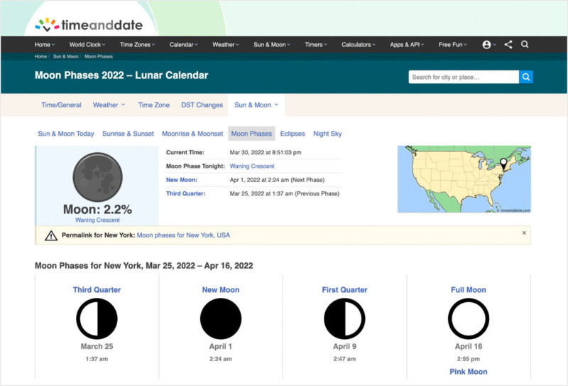 المرحلة التالية (يا للمفارقة!) في هذه الرحلة هي تحديد طور القمر. يوفر تطبيق Clear Outside وتطبيق Astrospheric هذه الخاصية، ولكن إذا كنت ترغب حقًا في التخطيط مسبقًا، فراجع موقع www.timeanddate.com أدخل موقعك وانتقل إلى الوقت الذي تريد التصوير فيه.
