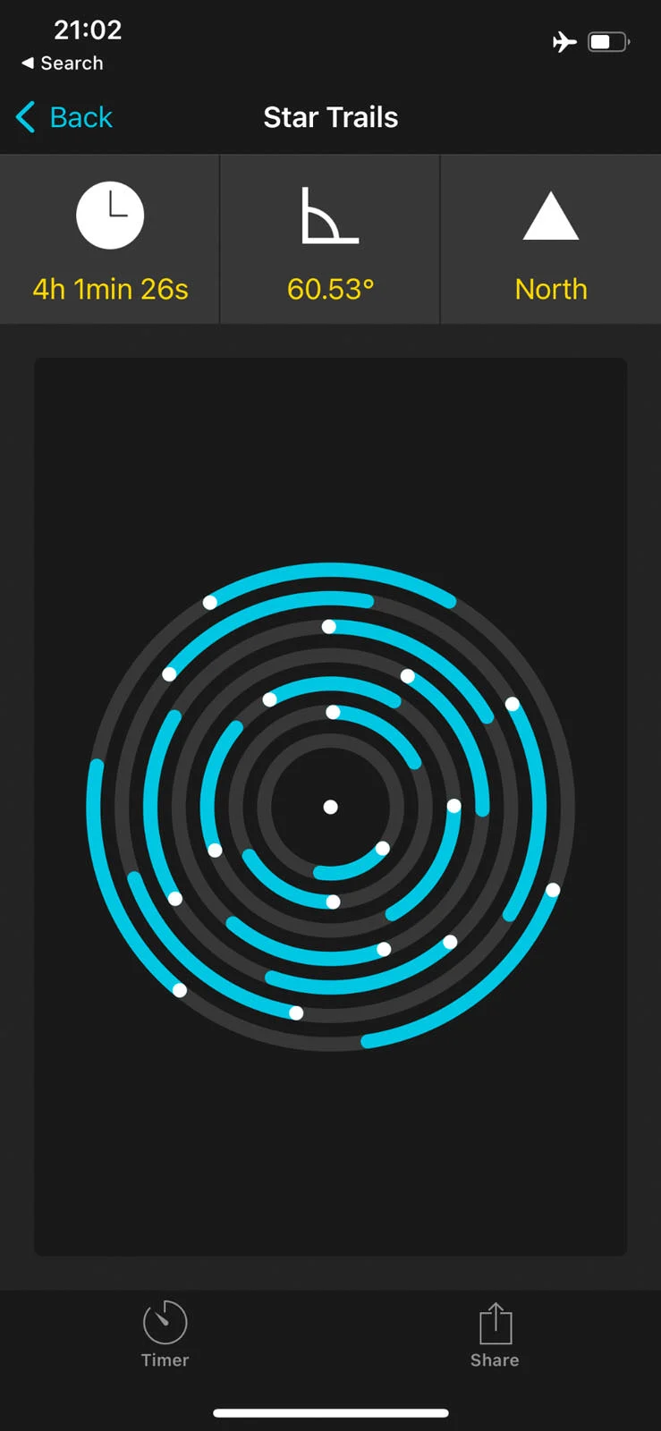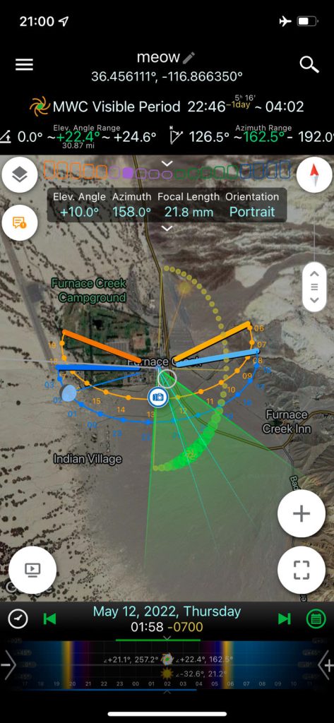بالإضافة إلى ذلك، استخدم تطبيقَي PhotoPills وPlanit لتحديد ذلك. يحتوي كل تطبيق على وضع تخطيط يُزوّدك بهذه المعلومات. لكن من عيوب هذه التطبيقات صغر حجم شاشة الهاتف وعدم وجود عرض كامل يُشبه عرض القبة السماوية، مما قد يُصعّب تحديد أوقات شروق وغروب الأهداف. يُوفّر تطبيق PhotoPills وظيفة مُخصصة لمركز مجرة درب التبانة والقمر وزخات الشهب، بينما يُتيح لك تطبيق Planit أيضًا إدخال أسماء بعض السدم والمجرات الشائعة.