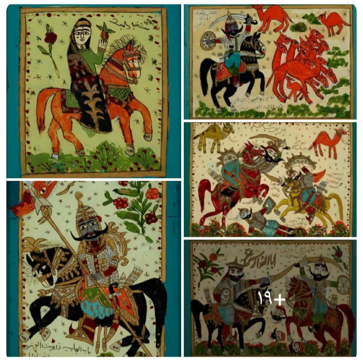 ورسومه مستلهمة من الحكايات الشعبية العربية،ولكن غالبيتها مكرسة لعنترة وعبلة،يرسمها على الزجاج بألوان حادة. يرسم عنترة رجلاً حقيقياً قوياً يشهر سيفه حين يكون وحده،متأهباً لمواجهة أعدائه ودحرهم. أما حين يكون برفقة عبلة فإن سيفه متوار في غمده. ويرسم عبلة امرأة جميلة عذبة،حزينة حزناً غامضاً،وممتطية صهوة جواد عربي أصيل.