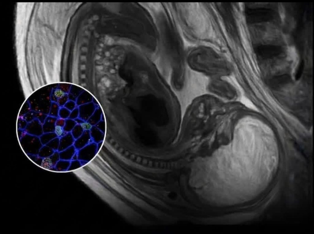 - خلايا الجنين في الأم: تنتقل خلايا الجنين إلى جسم الأم وتستقر في أعضاء مختلفة (كالقلب والكبد والدماغ) وقد تبقى لعقود بعد الولادة.
