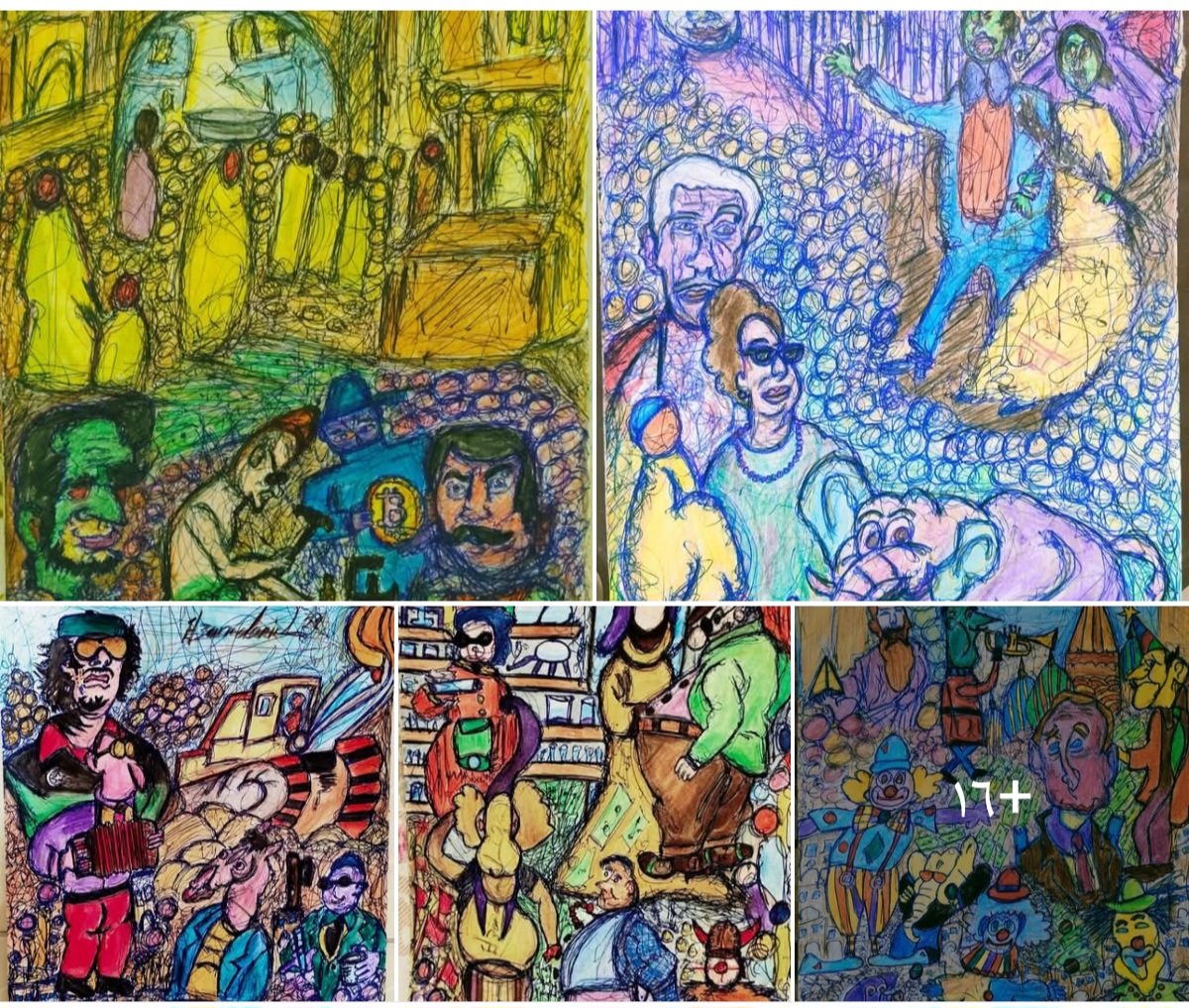 في هذه الأعمال الصغيرة للفنان المصري المعروف في الوسط التشكيلي بـ”العم دانيال”، يدخل المتلقي إلى عالمٍ بصريّ صاخب، لا تحكمه قواعد الواقعية ولا يطمئن إلى جماليات التمثيل الكلاسيكي، بل ينتمي إلى ذلك الحقل التعبيري الذي يخلط بين الكاريكاتير، والفن الفطري، والرمزية السياسية والاجتماعية الساخرة. إننا أمام لوحات تبدو للوهلة الأولى أقرب إلى مشهدٍ طفولي فوضوي عبثي، لكنها في الحقيقة تخفي خلف هذه الفوضى البصرية خطابًا نقديًا حادًا عن العالم المعاصر.