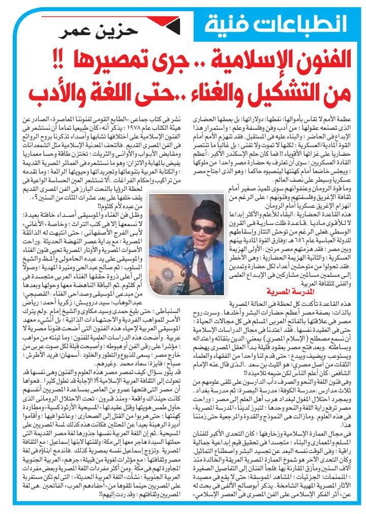 وظل فن الغناء والموسيقى أصداء خافتة بعيدة؛ لا نسمعها إلا في كتب التراث ؛ وخاصة (الأغاني) لأبي الفرج الأصفهاني ؛ حتى انتبهت له الذائقة المصرية ؛ مع بداية عصر النهضة الحديثة ..وراحت الأصوات المصرية والأوتار المصرية تحيي فنون الغناء والموسيقى على يد عبده الحامولي وألمظ والشيخ المسلوب ؛ ثم صالح عبدالحي ومنيرة المهدية ؛ وصولا إلى أعلى ذروة حققها الغناء العربي متجسدة في أم كلثوم..ثم الباقة الناهضة معها وحولها وبعدها من مبدعي الموسيقى وصداحي الغناء : القصبجي؛ عبدالوهاب؛ سيد درويش؛ زكريا أحمد؛ رياض السنباطي ؛ حتى بليغ حمدي وسيد مكاوي والشيخ إمام ..ولم يترك الأمر للمواهب الفردية والاجتهادات الذاتية ؛ بل أنشىيء معهد الموسيقى العربية لإحياء هذه الفنون التي أضحت فنونا مصرية لا عربية.. وأضحت هذه الدراسات العلمية للفنون ؛ وما تبنته من مواهب ؛ مؤشرا على رقي الفن أو هبوطه ؛ وأصبحت قبلة لكل صوت عربي من خارج مصر ؛ يسعى للذيوع والتطور والخلود : أسمهان؛ فريد الأطرش ؛ صباح ؛ فايزة؛ سعاد محمد ..وغيرهم..