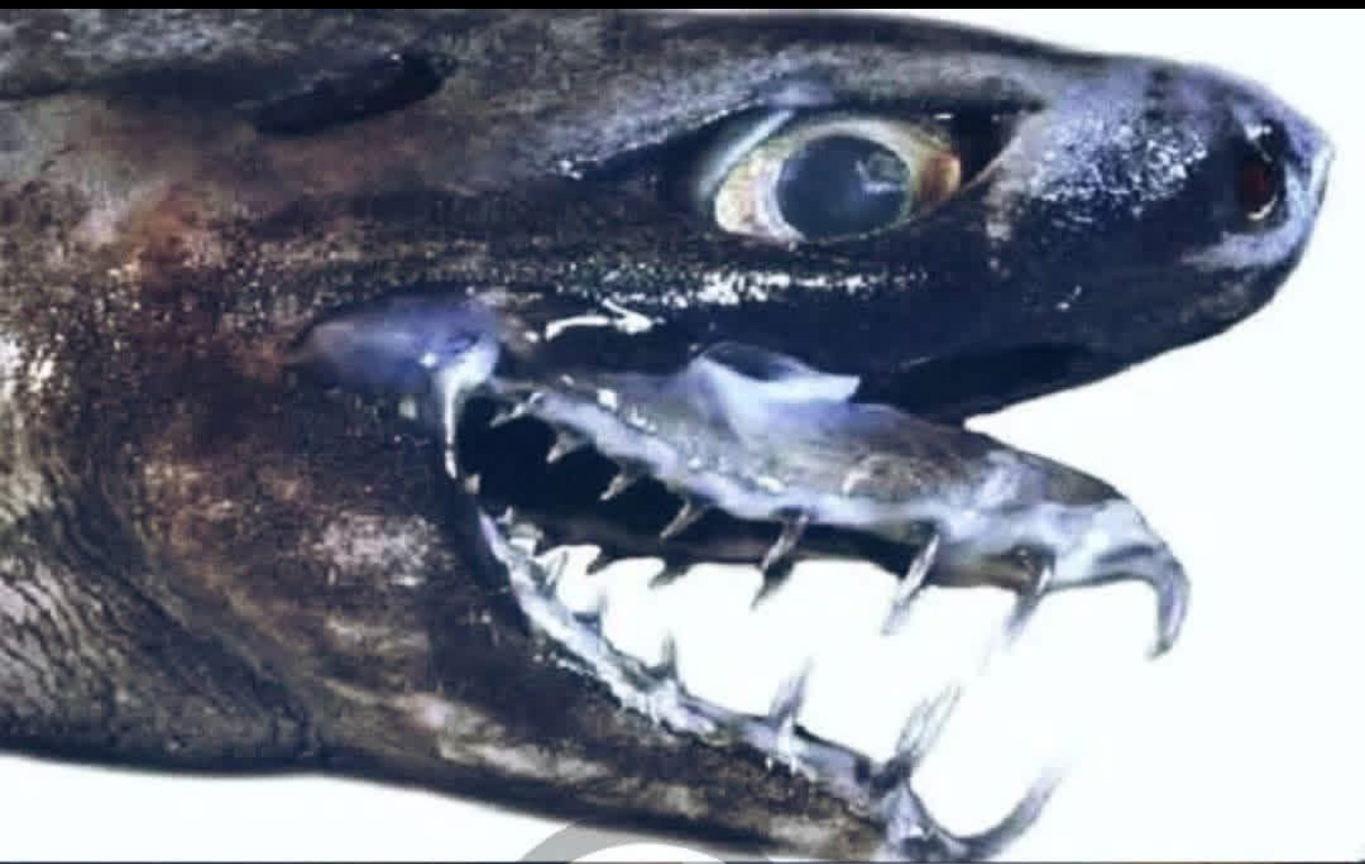 هذه السمكة النادرة تمتلك نوعين من الفكين. طويل ومثلث بشكل حاد، يمكن أن تمتد فكه إلى الخارج في لمح البصر لانتزاع الفريسة أمامها مباشرة.