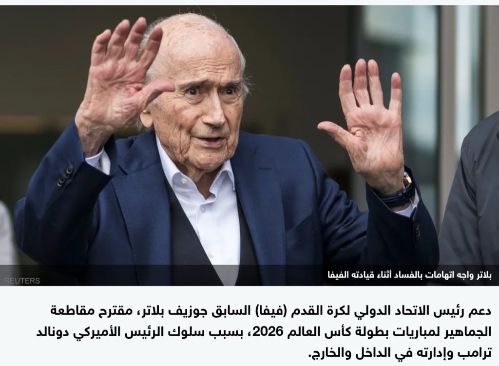 دعم رئيس الاتحاد الدولي لكرة القدم (فيفا) السابق جوزيف بلاتر، مقترح مقاطعة الجماهير لمباريات بطولة كأس العالم 2026، بسبب سلوك الرئيس الأميركي دونالد ترامب وإدارته في الداخل والخارج.