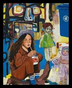 في العمل المعروض نلحظ طفلة تجلس على الأرض بملابس بسيطة، تمسك بعلبة شراب وتمتصها عبر أنبوب.