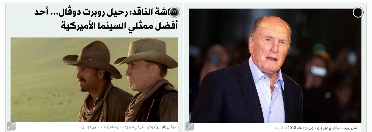 في 15 فبراير (شباط) الحالي، رحل الممثل روبرت دوڤال عن عمر ناهز 95 عاماً. كان ممثلاً نادراً لم يُخطئ في أدواره، سواء كانت رئيسية أم صغيرة. فمن سائق التاكسي في «بولِت»، إلى جنرال الحرب في «القيامة الآن»، وصولاً إلى أدواره البارزة في «العرّاب» بجزأيه الأول والثاني، قدّم دوڤال شخصيات اتّسمت بأداء هادئ وطبيعي، يقوم على اندماج سلس وعميق مع الشخصية التي يجسّدها.