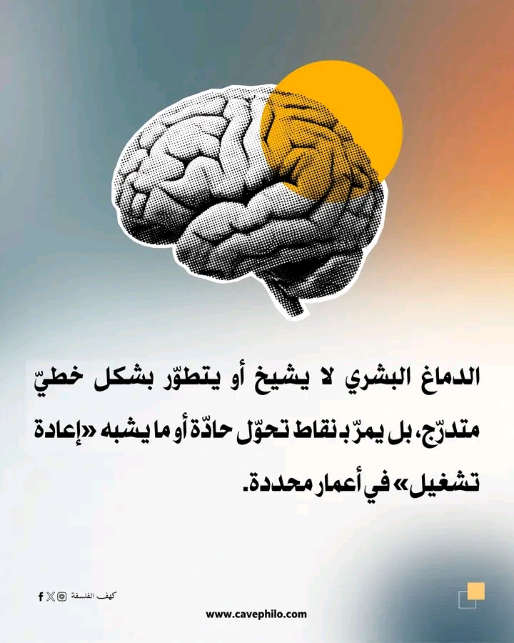 #الدماغ_البشري لا يشيخ أو يتطوّر بشكل خطيّ متدرّج، بل يمرّ بـ نقاط تحوّل حادّة أو ما يشبه «إعادة تشغيل» في أعمار محددة.▪︎المراحل الأربع الحاسمة:1.سن 9 سنوات-نهاية الطفولة العصبية.-تقليم الوصلات العصبية وبداية التنظيم والكفاءة.-تشكّل شبكات دماغية متخصصة.2.سن 32 سنة-ذروة النضج العصبي.-أعلى كفاءة معرفية واستقرار طويل (حتى 66).-الدماغ في أفضل توازن بين المرونة والكفاءة.3.سن 66 سنة-نهاية الاستقرار العصبي.-الدماغ يعيد تنظيم نفسه نحو التخصص المحلي.-فقدان بعض التفاصيل مقابل تعزيز المعنى والروابط العاطفية.4.سن 83 سنة-إعادة تنظيم جذرية لمسارات الاتصال.-التعويض بدل الفقد: طرق -أطول، لكن أكثر تركيزًا.#هل أعجبك هذا #تابعنا للمزيد #كهف_الفلسفة #مجلة ايليت فوتو ارت.
