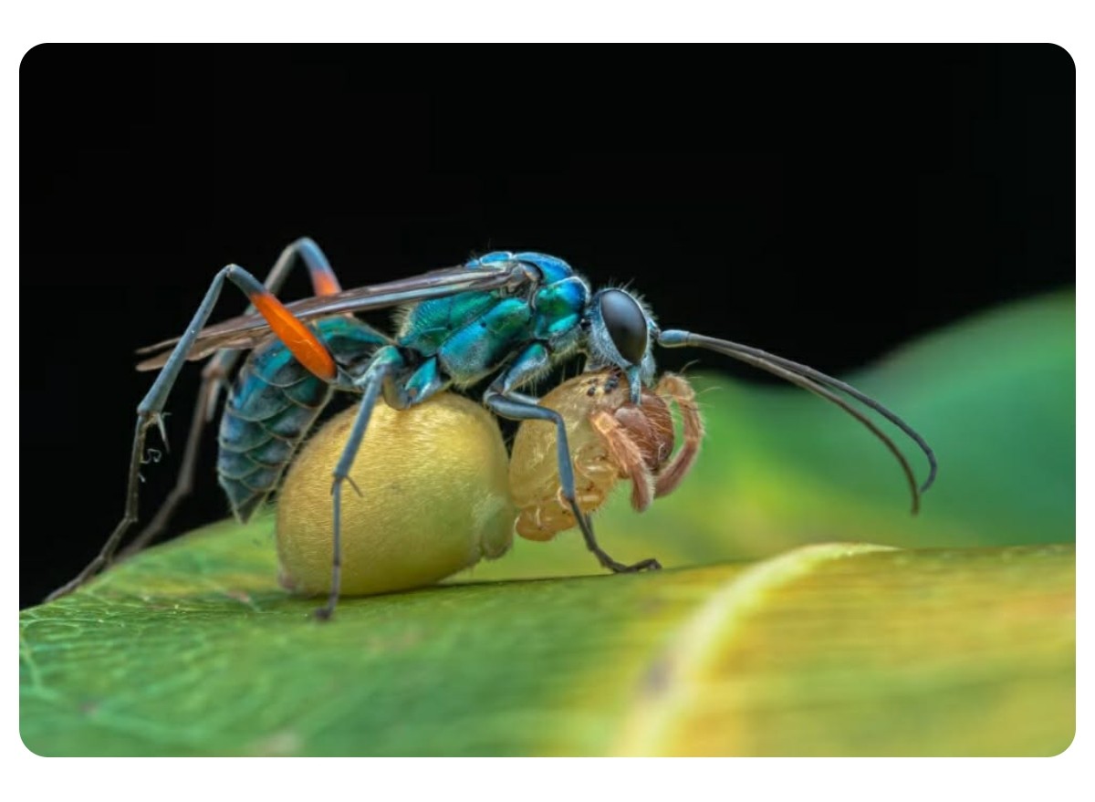 عندما هيأ كاميرته لتوثيق المشهد، اكتشف كاليتا أن الحشرة كانت تحمل مفاجأة، إذ قال في مقابلةٍ مع موقع CNN بالعربية: “بعد أن شاهدتها تظهر وتختفي عدة مرات، أدركتُ أنها كانت تحمل فريسة لصغارها”.