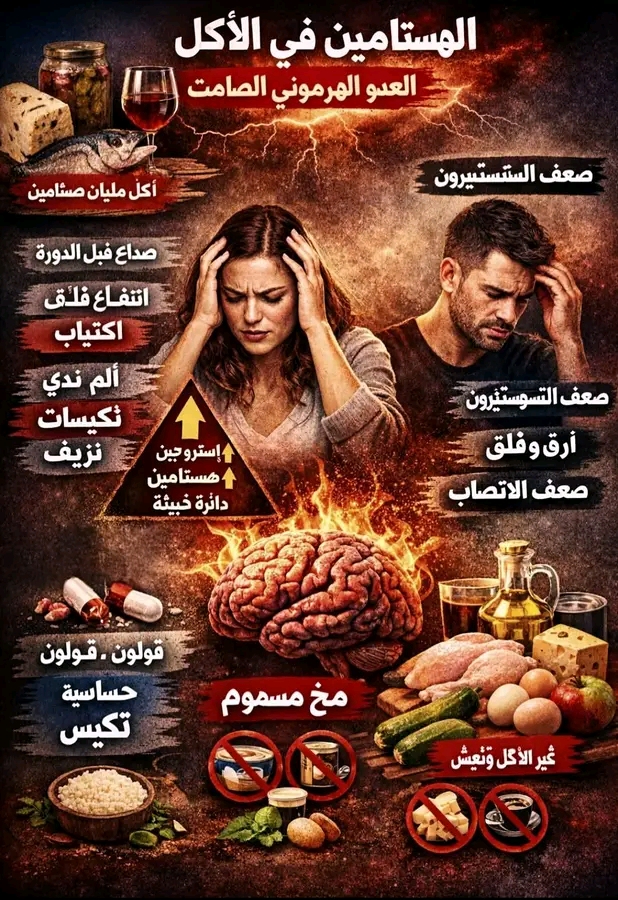 ⚠️ السمّ اللي في طبقك… كيف يدمّر الهستامين أعصابك وهرموناتك بصمت؟ناس كتير فاكرة إن الهستامينمجرد مادة بتعمل حساسية وخلاص.لكن الحقيقة أخطر بكتير…الهستامين مادة كيميائيةجسمك بينتجها طبيعيوأكلك كمان بيدخلها لجسمك كل يوم.دوره الطبيعي:ينبه المخينشّط المناعةلكن لما يعلى عن الحد…بيتحول من منقذإلى سمّ عصبي وهرموني.🔴 منين بييجي الهستامين في الأكل؟أي أكل:متخزنمتخمّربايتمصنعبيكون الهستامين فيه أعلى بكتير.أشهر مصادره: التونة – الجبن – الزبادي – المخللات – الخلالطماطم – السبانخ – الفراولة – الصوياالشوكولاتة – القهوة – اللحمة القديمة أو المجمدة فترة طويلة🧬 الجسم الطبيعي يعمل إيه؟في إنزيم مهم اسمه DAOوظيفته يكسر الهستامين اللي داخل من الأكل.المصيبة تحصل لما الإنزيم ده يضعف بسبب:خراب الأمعاءتسريب معوينقص فيتامين B6نقص زنك أو نحاسضغط نفسي مزمنارتفاع الإستروجينيعني باختصار:لخبطة الهرمونات = هستامين أعلى تلقائيًا.👩 عند السيدات… لعبة نارالهستامين يرفع الإستروجينوالإستروجين يرفع الهستامينحلقة مغلقة مدمّرة.لما الهستامين يعلى عند الست يحصل:صداع قبل الدورةانتفاخ وبطن منفوخةقلق مفاجئاكتئاب قبل الدورةأرقألم في الثديتكيسات وضعف تبويضحب شباب وأكزيمانزيف غير طبيعيتخمة وخمول بعد الأكلويتقال عليها: “هرمونات”بينما الحقيقة:الدماغ متسمم هستامين.👨 عند الرجال…الهستامين العالي:يقلل التستوستيرونيرفع الكورتيزوليسبب قلق وأرقيضعف النوميضر الانتصاب والطاقةالهستامين هنازي كافيين داخلي دائميخليك متوتر، عصبي، ومش قادر تهدأ.🚨 مين أكتر ناس في خطر؟لو عندك:قولون عصبيحساسية أو ربوصداع نصفيتكيساكتئاب أو أرقانتفاخ بعد الأكلغالبًا عندك:عدم تحمّل هستامين.🛑 خدعة مضادات الحساسيةالأدوية: تقفل المستقبللكن تسيب السم جوه الدمزي إنك تطفي جرس الإنذاروالحريق مولّع.🟢 خطة تقليل الهستامينامنع: التونة – الجبن – الزبادي – الطماطم – السبانخالخل – المخللات – القهوة – الشوكولاتة – الأكل البايتواختار: رز – بطاطس – لحمة طازة – فراخ طازة – بيضكوسة – خيار – تفاح – مانجا – زيت زيتون🧩 عناصر نقصها يرفع الهستامين:فيتامين B6زنكنحاسفيتامين Cمغنيسيوم📌 الخلاصة الخطيرة:الهستامينمش مجرد حساسية…ده مخرب هرموناتوسمّ أعصاب.لو عالي:الست تتدمّر نفسيًا وهرمونيًاالراجل يفقد طاقته وتركيزهوالكل يقول: “ضغط نفسي”بينما الحقيقة أبسط وأخطر:الطبق اللي بتاكله… هو اللي سمّم دماغك. # اية الاحمد # الصحة والجمال #مجلة ايليت فوتو ارت.