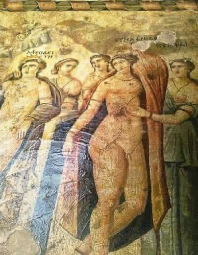 من فسيفساء أفاميا المفقودة ،لوحة المخلوق المخنث هيرمافروديتوس والفلسفة الأفلاطونية======================هذه الوحة من فسيفساء أفاميا المفقودة، وأفاميا كما هو معروف كانت عاصمة الافلاطونية المحدثة في القرنين الثالث والرابع الميلاديين.وهي لوحة تمثل أسطورة إنجاب إلهة الجمال أفروديت التي تبدو في يسار اللوحة ملكة متوجة من زوجها هيرمس، لهذا الكائن الخنثى الذي/ التي يقف/ تقف عارياً/ عارية في يمين اللوحة فهو ابن الالهين المسمى هيرمافروديتوس (Hermaphroditus). وبحسب الميثولوجيا اليونانية وفقا لأوفيد، فقد كان ابن أفروديت وهيرميس فتى غاية في الوسامة فأحبته إحدى الحوريات وتوسلت للآلهة بأن يتحد معها للأبد، فاستجاب الاله زيوس لتوسلاتها ودمج بينهما فكان هذا الكائن الذي يجمع في جسده صفات الانوثة والذكورة في آن معاً، وأخذ اسمه من والديه معاً أفروديت وهيرميس.ويعد هذا الموضوع تجسيد حي يوضح فهم أفلاطون للحب والذكورة والأنوثة، والذي عرضه في كتابه الوليمة.فقد كان أفلاطون يقول إن طبيعة الإنسان قديمأ لم تكن كما هي عليه اليوم، ففي البدء كان هناك ثلاثة أجناس وليس جنسين: ذكر وأنثى وجنس ثالث مكون من الاثنين معاً. وليس لهذا الجنس الثالث أثر الآن غير اسمه : (Hermaphroditus) أي خنثى .وكانت تلك الكائنات قوية فاعتراها الغرور وحاولت أن تنافس الآلهة. فغضب زيوس وتفكر طويلاً وقرر أن ينقذ الجنس البشري من الفناء، وفي الوقت ذاته، يضع حداً لهذه الكائنات، فشطر زيوس كل مخلوق إلى شطرين متساويين، وأمر أبولو بأن يدير الوجه ونصف الرقبة إلى ناحية الجانب الأخر المشطور حتى ترى الضحية علامات الشطر ماثلة أمامها فتخضع للآلهة ولا تعود إلى سيرتها القديمة. كما أمر أبولو بمعالجة الجروح، وإزالة جميع آثار الفصل، وترك بعض التجاعيد على البطن حتى يتذكر لإنسان ما كان عليه وما حدث له فيتعظ . وبعد أن تم ذلك، أخذ كل شطر يبحث عن شطره الآخر، فإذا التقيا تعانقا وكأنهما يريدان أن يعودا كائناً واحداً، ويبقيا متعانقين حتى الموت.#د.جوزيف زيتون#مجلة ايليت فوتو ارت..