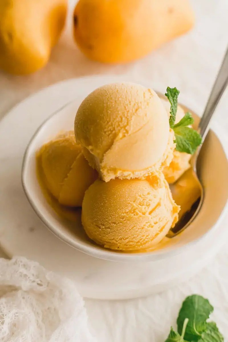 وأخيرًا، كل ما تبقى عليك فعله هو استخدام مغرفة الآيس كريم أو أي شيء لديك في المنزل لتساعد نفسك على الحصول على جزء من آيس كريم المانجو الخفيف. يمكنك تزيينها بالمكسرات، أو قطع المانجو، أو الشوكولاتة، أو القليل من النعناع لتقديم أفضل.