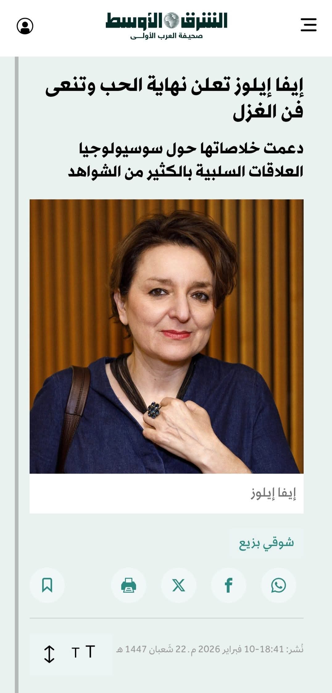 ايفا إيلوز تعلن عن نهاية الحب وتنعى فن الغزل