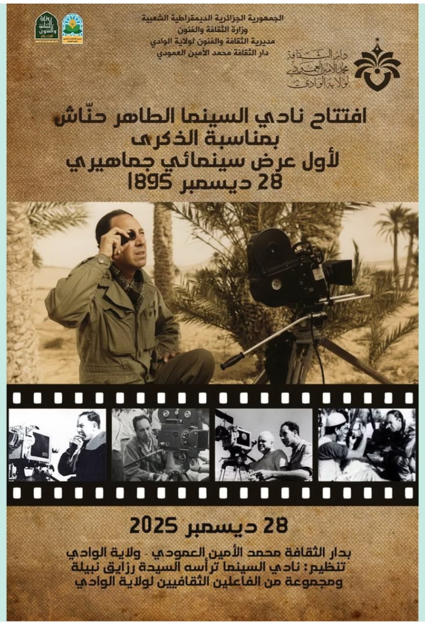 🔸 بمناسبة الذكرى الـ130 لأول عرض جماهيري للسينما الذي أقامه الأخوان لوميير يوم 28 ديسمبر 1895، يُفتتح اليوم 28 ديسمبر 2025 بدار الثقافة محمد الأمين العمودي نادي السينما باسم الرائد الطاهر حنّاش، الأب الصامت للسينما الوطنية والتلفزيون الجزائري، الذي جعل من الكاميرا سلاحًا للحرية وذاكرةً للأمة.