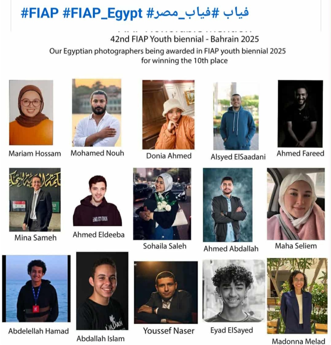 للدورة الثانية على التوالى بعد فوزهم بالمركز الثالث فى دوره ٢٠٢٣ حقق شباب المصورين المصريين إنجازًا دوليًا جديدًا بعد فوزهم بالجائزة الشرفية ضمن افضل ١٠ دول شاركت في بينالي الشباب للاتحاد الدولي للتصوير الفوتوغرافي (FIAP) 2025، وذلك بمشاركة واسعة من أكثر من 40 دولة حول العالم. ويُعد هذا الفوز تتويجًا لجهود مستمرة في دعم المواهب الشابة وتعزيز حضور مصر على الخريطة العالمية للتصوير الفني.