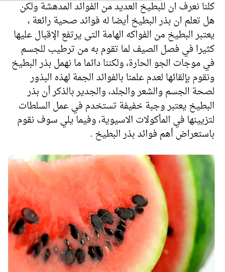 1- يحتاج الجسم إلى نسبة من الأحماض الأمينية، كما أنه يوجد بعض الأحماض الأمينية التي لا ينتجها الجسم مثل الأرجنين والليسين، كما أن بذر البطيخ يحتوي على بعض الأحماض الأمينية الأساسية مثل التربتوفات وحمض الجلوتاميك.2- بذر البطيخ يعتبر مصدرا هاما لعنصر الماغنسيوم حيث أن 100 جرام من بذر البطيخ تحتوي على ما يعادل 139 % من النسبة اليومية الموصي بها من الماغنسيوم، وهو عنصر هام للحفاظ على صحة القلب وعلى مستوى ضغط الدم، ويعزز من عملية التمثيل الغذائي وتخليق البروتين.3- تحتوي بذور البطيخ على الليكوبين وهو هام لبشرة الوجه وللخصوبة لدى الرجال.4- بذر البطيخ يعتبر مصدرا هاما لفيتامين ب بأنواعه المختلفة مثل النياسين ، حمض الفوليك ، الثيامين ، الريبوفلافين ، وفيتامين ب6 وحمض البانتوثنيك حيث أن فيتامين ب هام جدا لتقوية الدورة الدموية والجهاز العصبي والمناعي.5- يستخدم بذر البطيخ أيضا لعلاج مرض السكري، حيث تغلى حفنة من بذر البطيخ في الماء لمدة 45 دقيقة# معلومات صحية بسيطة ومفيدة # مجلة ايليت فوتو ارت.