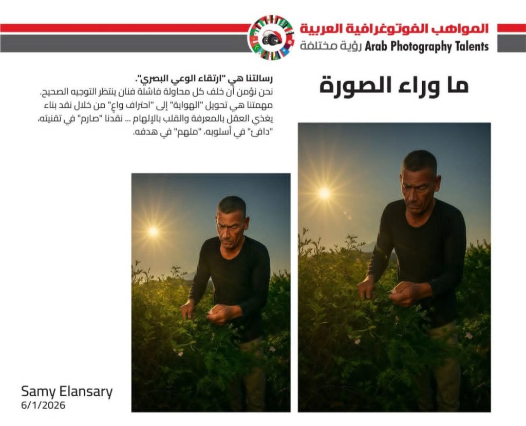 أرى في هذا العمل روحاً تتنفس الصدق والوقار. لقد نجحت في تجميد لحظة زمنية يبدو فيها الكون وكأنه يتوقف احتراماً للعمل وللاتصال العميق بين الإنسان وأرضه. هذا ليس مجرد تصوير زراعي، بل هو بورتريه بيئي يروي قصة كفاح وصبر دون أن ينطق بكلمة واحدة. التقاطك للصورة عكس اتجاه الشمس خطوة شجاعة تُظهر نضجاً في رؤيتك الفنية.