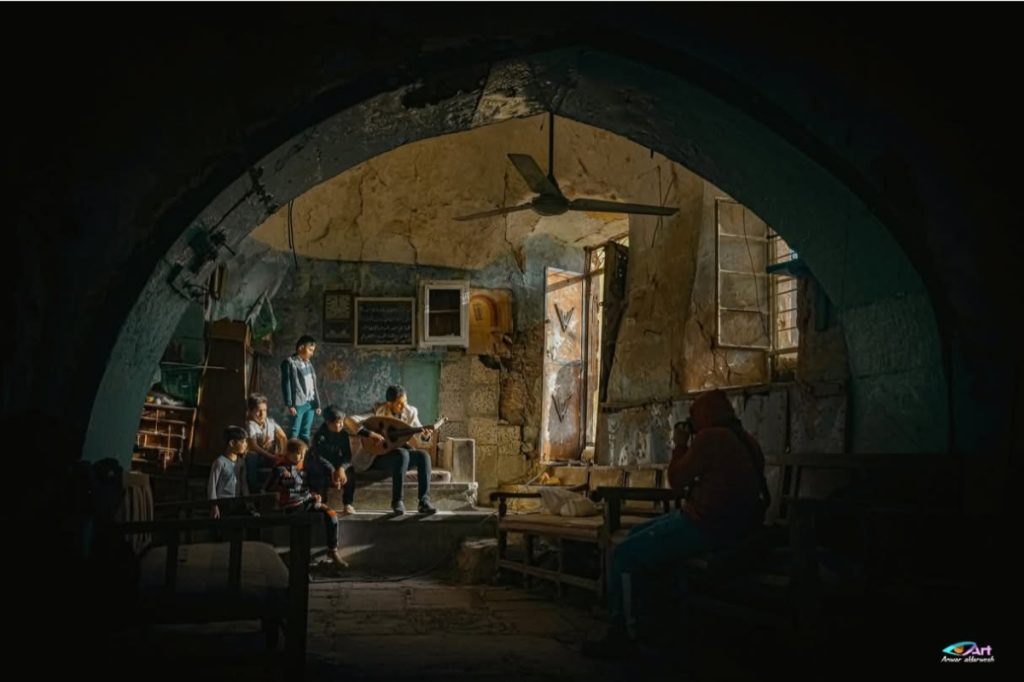 لقد حاولت من خلال الفتحات العلوية والجانبية ( الشباك والباب )   توظيف الضوء الطبيعي المتدفق وباسلوب التضاد الحاد بين الضوء والظلمة  ان اركز انتباه المشاهد الى البؤره  ( عازف العود ) . بينما تظل أطراف الصورة غارقة في العتمة لتمنح المكان هيبة وسيادة و تعزز قيمة المركز ..