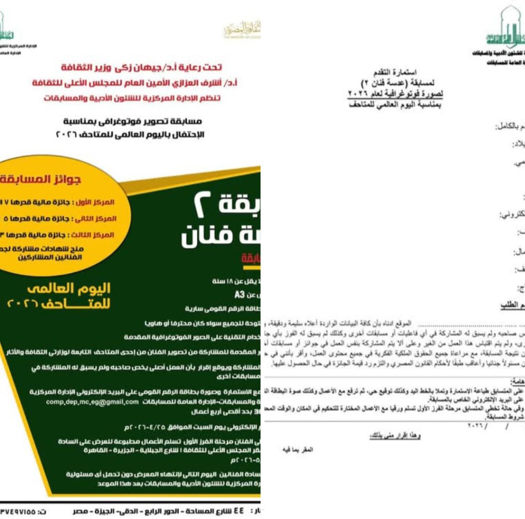 ترفع الأعمال مع الاستمارة وصورة بطاقة الرقم القومى على البريد الإلكتروني الإدارة المركزية للشئون الأدبية والمسابقات – الإدارة العامة للمسابقات comp.dep.mc.eg@gmail.com بجودة 300 بحد أقصى أربع أعمال
