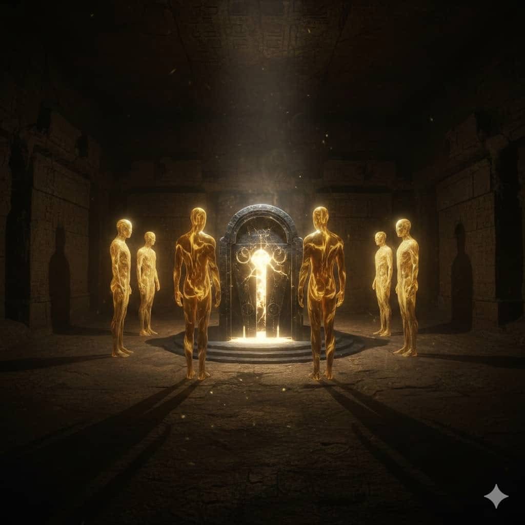 ​”أراهم.. ليسوا بشراً.. سبعة كيانات من النور المسال، بلا ملامح وبلا رحمة. يقفون في دائرة مغلقة حوله. لا يتحدثون بالأفواه، بل يزرعون أفكارهم داخل جمجمتي مباشرة.. نورهم يمزق حجاب الحقيقة!”