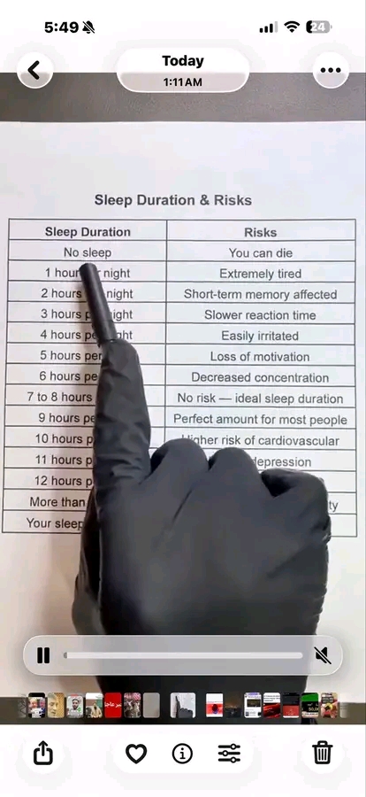 ‏🚨مدة النوم وتأثيرها على حالتك الصحية. عدم النوم. قد يؤدي إلى الوفاة النوم 1 ساعة. إرهاق شديد النوم ساعتين. تأثر الذاكرة قصيرة المدى للنوم 3 ساعات. بطء في ردة الفعل للنوم 4 ساعات. سهولة الانفعال النوم 5 ساعات. فقدان الحافزالنوم 6 ساعات. انخفاض التركيز7-8 ساعات. لا يوجد خطر – مدة المثالية9 ساعات. فترة مثالية لمعظم الناس10 ساعات. خطر الإصابة بأمراض القلب والأوعية الدموية11 ساعة. الإصابة الاكتئاب. 12 ساعة. الإصابة بالسمنة
