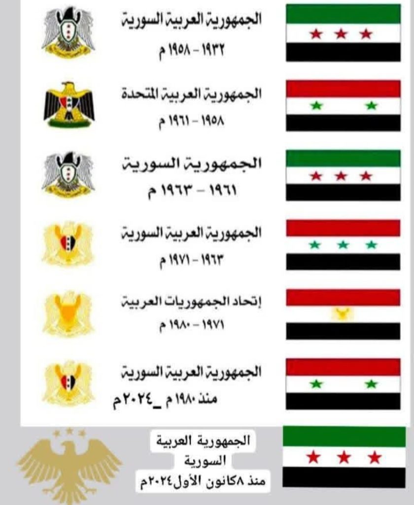 * تطور العلم السوري وشعارات الدولة منذ عام 1920م ليعكس تقلبات سياسية تاريخية، بدءاً من علم “المملكة السورية العربية” (أسود، أخضر، أبيض مع نجمة)، مروراً بأعلام الانتداب الفرنسي ودول التقسيم، وعلم الاستقلال (أخضر، أبيض، أسود مع 3 نجوم حمراء) الذي اعتمِد عام 1932، ثم علم الوحدة مع مصر (نجمتان خضراوان)، وصولاً إلى العلم الحالي ذو النجمتين (الأحمر، الأبيض، الأسود) الذي أقر عام 1980، بينما عادت المعارضة لرفع علم الاستقلال.