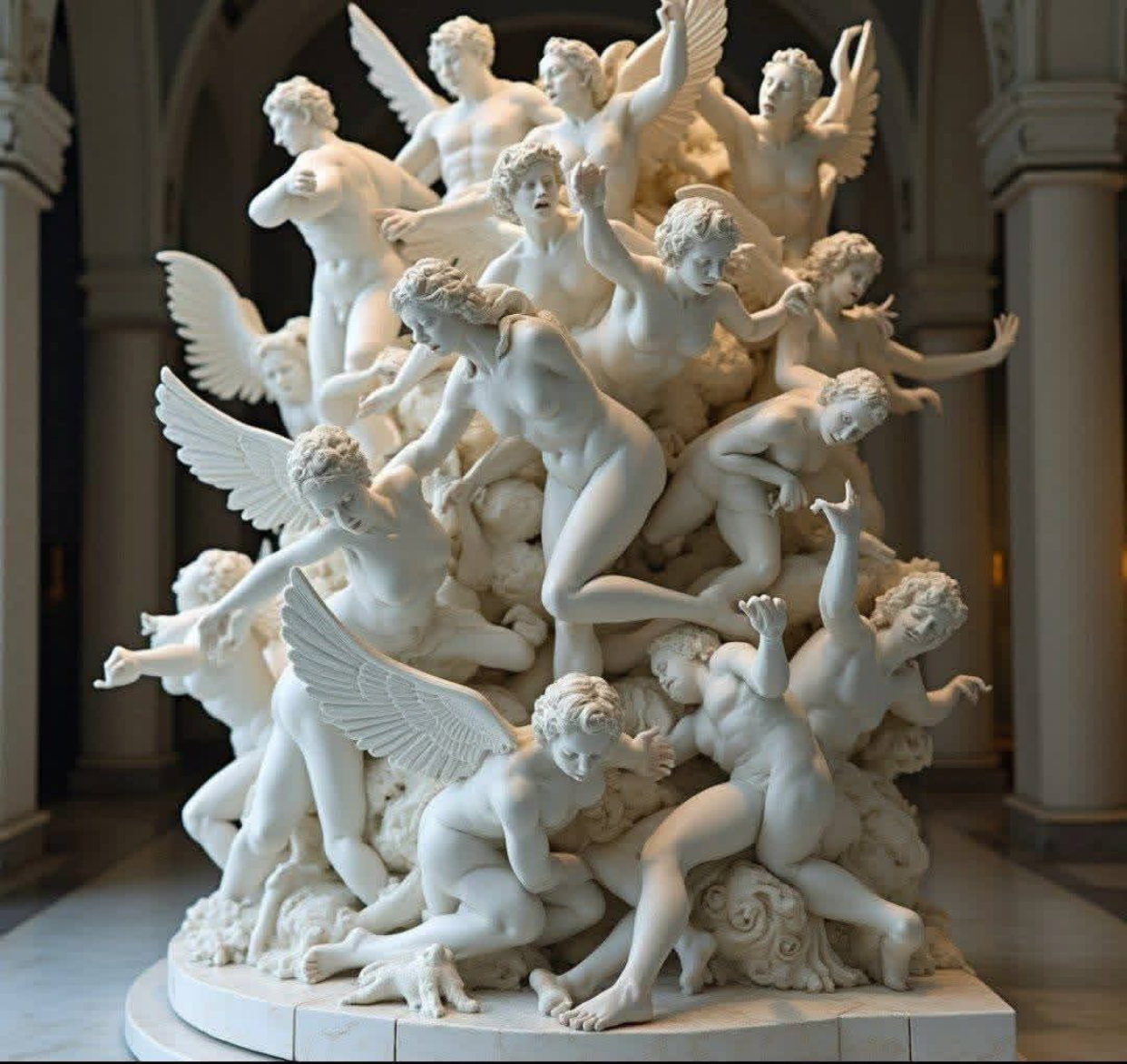 منحوتة من كتلة رخامية واحدة، تصور هذا التمثال الخلاب 60 ملاكاً يتساقطون في سقوط حر فوضوي. التفاصيل المعقدة لفاسولاتو وحركة درامية تأسر الغضب الإلهي الذي لا مثيل له. تألق الباروك في الحجر.
