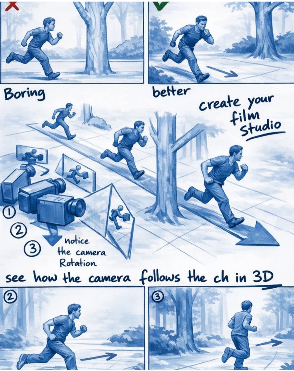 بدل ما تكون الكاميرا ثابتة والشخصية تمشي وتطلع “لقطة تلفزيونية عادية”…