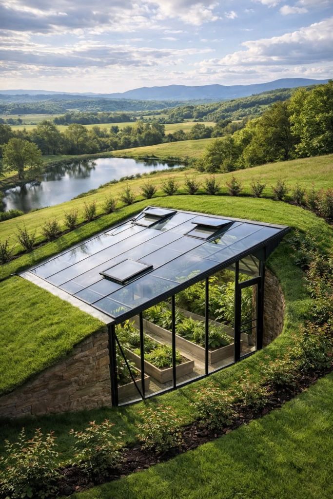 تصميم البيوت الزراعية المدفونة في الأرض، حيث تتكامل الهندسة المعمارية مع التربة وضوء الشمس لخلق بيئة زراعيةصحية.
