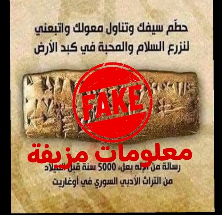 ‘كثيراً ما يتم تداول هذه الصورة الشهيرة المرفقة بالمقال والتي تظهر نقشاً مسمارياً يتضمن ادعاء بأن هذه العبارة هي نص أوغاريتي من أساطير الإله الكنعاني بعل، تقول كما ورد في الصورة:”حطم سيفك، وتناول معولك، واتبعني لنزرع السلام والمحبة في كبد الأرض” رسالة من الإله بعل، 5000 سنة قبل الميلاد، من التراث الأدبي السوري في أوغاريت.”في الحقيقة، هذه العبارة، على الرغم من جمالها في الشكل والمضمون لكنها للأسف خرافة محضة من حيث الأصل الأثري واللغوي ولا تستند إلى أي مصدر معروف في نصوص أوغاريت أو أي نص آخر من التراث الكنعاني.والملاحظات يمكن لأي مبتدئ بالتاريخ ملاحظتها هي كالتالي:1. أوغاريت لم تكن موجودة عام 5000 ق م، أوغاريت ازدهرت في الألف الثاني قبل الميلاد، وتحديداً بين عامي 1450–1200 ق م ، ولم تكن هناك كتابة أبجدية أو مسمارية خاصة بها قبل هذا التاريخ.2. العبارة لا وجود لها في أي لوح مكتشف: لم يُعثر على أي نقش أوغاريتي يحمل هذا القول، لا في “ملحمة بعل”، ولا في النصوص الطقسية .3. اللوح الطيني المرفق في الصورة لا يُظهر هذا النص و هو عبارة عن لوح تدريبي تعليمي يُعرف في الأوساط الأكاديمية باسم: Ugaritic Abecedary “أبجدية أوغاريتية”، ويُصنف ضمن الأدوات التربوية للكتبة والمتعلمين في أوغاريت، مكتوب عليه 30 رمزاً مسمارياً، تمثل الأبجدية الأوغاريتية اكتُشف في رأس شمرا (أوغاريت الحديثة)، ويعود تاريخه إلى القرن 13 ق م، لا يحتوي على نص ديني أو شعري، بل فقط ترتيب الحروف:𐎀 أ، 𐎁 ب، 𐎂 ج، 𐎃 خ، 𐎄 د، 𐎅 هـ، 𐎆 و، 𐎇 ز، 𐎈 ح، 𐎉 ط، 𐎊 ي، 𐎋 ك، 𐎌 ش، 𐎍 ل، 𐎎 م، 𐎏 ن، 𐎐 ث، 𐎑 س، 𐎒 ع، 𐎓 ف، 𐎔 ص، 𐎕 ق، 𐎖 ر𐎗 ط (صوت مختلف عن الطاء السابقة)𐎘 ش (صوت مختلف عن الشين السابقة)، 𐎙 ت، 𐎚 غ، 𐎛 س (صوت مختلف)، 𐎜 ث (صوت مختلف)لا يوجد في هذا اللوح أي ذكر لكلمة “سلام”، أو “معول”، أو “محبة”، ولا ذكر للإله بعل في أي سطر، ولا تظهر فيه جمل أو تركيبات نحوية، بل رموز منفصلة بالتالي، فإن الادعاء بأن هذه الصورة تمثل رسالة أخلاقية من الإله بعل هو تزوير حديث لمحتوى أثري معروف.وبتوضيح أكثر، يرتكز الأدب الأوغاريتي على سياق ثقافي وديني مختلف جذرياً عن المفاهيم الأخلاقية الحديثة فهو يتناول في جوهره صراعات الآلهة وأدوارهم في الحفاظ على النظام الكوني والاجتماعي على سبيل المثال: تركز نصوص مثل ملحمة بعل وأسطورة كيريت على الصراعات المحورية بين الآلهة، حيث تشكل معركة بعل ضد الإله يم أو موت رمزاً للصراع بين النظام والفوضى، والخصب والجفاف. يرتبط هذا الأدب أيضاً ارتباطاً وثيقاً بطقوس الخصب والزراعة، إذ يمثل بعل إله المطر والعواصف وهذه الصراعة محاكاة للطبيعة تؤدي في نهايتها إلى ازدهار الأرض وحياة الإنسان.أضف إلى ذلك أن الأدب الأوغاريتي يعكس العلاقة بين البشر والآلهة من خلال التضحيات والصلوات والطاعة، وهي أدوات الحفاظ على رضا الآلهة وضمان استمرار دورة الحياة.لذلك فإن مفاهيم “المحبة والسلام” في النصوص الأوغاريتية ليست مفاهيم عالمية، بل هي تعبير عن الاستقرار الداخلي للمملكة ورضا الآلهة عن رعاياها، بالتالي وظيفتها دينية سياسية بحتة.وفي النهاية الخرافة المنسوبة إلى بعل هي تركيب عصري حديث مزيف لا وجود له في المصادر القديمة، ويعتمد على صورة غير دقيقة للآلهة الكنعانية. أما النصوص الأوغاريتية الحقيقية، فهي أغزر وأعمق، وتتناول الزراعة والخصب والحكمة والطقوس الدينية بأسلوب شعري دقيق لذلك للمهتمين من الأفضل لهم الرجوع إلى هذه النصوص كما هي في مصادرها ، بدل اختراع اقتباسات لا جذر لها في التراث الحقيقي.حاشيةسأنقل لكم مجموعة من مقاطع حقيقية من الأدب الأوغاريتي، تعبّر عن أدوار بعل أو تصور القيم الأخلاقية والزراعية، بما يقارب أحياناً مضمون الخرافة الملفقة:النص الأول (KTU 1.4):𐎊𐎉𐎗 (ي – ط – ط) 𐎀𐎓 (أ – ل) 𐎗𐎘𐎍 (ط – ص – ع) 𐎔𐎚 (م – ن) 𐎈𐎎𐎕 (ح – ك – ت) 𐎌𐎐 (س – ن) 𐎎𐎍𐎟 (ك – ع – (وقفة)) 𐎚𐎗𐎘𐎊 (ن – ط – ص – ي) 𐎚𐎗𐎘𐎊 (ن – ط – ص – ي) 𐎌𐎐 (س – ن) 𐎅𐎁