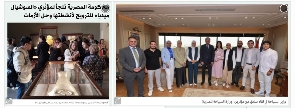 وفي وقت سابق، التقى وزير السياحة والآثار، شريف فتحي، عدداً من المؤثرين على «السوشيال ميديا» للتعريف بحملات الترويج السياحي التي تُطلقها الوزارة، وهم، وفق بيان للوزارة، من أصحاب المحتوى الرقمي الهادف والراقي، الذين يتمتعون بقاعدة متابعة واسعة على منصات التواصل الاجتماعي، لبحث سبل التعاون المشترك للترويج للمقصد السياحي المصري والمشاركة في حملة «إحنا مصر»، للتركيز على إبراز التنوع الفريد الذي تتميز به مصر من منتجات وأنماط سياحية متعددة، تحت شعار: «مصر… تنوع لا يُضاهى».